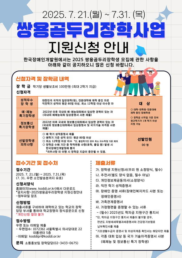 한국장애인개발원이 오는 7월 21일부터 31일까지 ‘2025년도 쌍용곰두리장학생’을 모집한다고 4일 밝혔다. 이번 장학사업은 장애학생의 학업 지속과 경제적 부담 완화를 목적으로 추진된다.