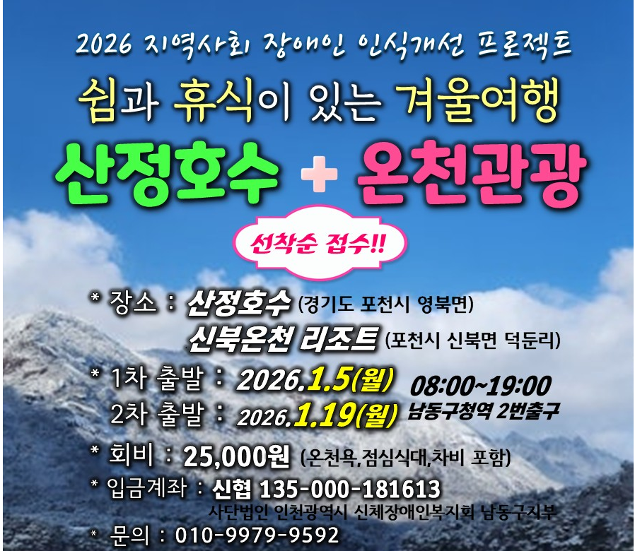 사)인천신체장애인복지회 남동구지부와 대한장애인협회에서는 장애인 인식개선 및 문화복지 프로젝트의 일환으로 당일 여행 참여자를 모집합니다.