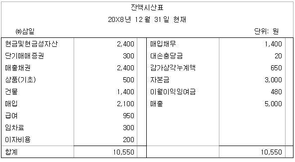 | 물음) 20X8년 12월 31일 현재 상품매매업을 영위하는 ㈜삼일의 수정전 잔액시산표와 | ||||