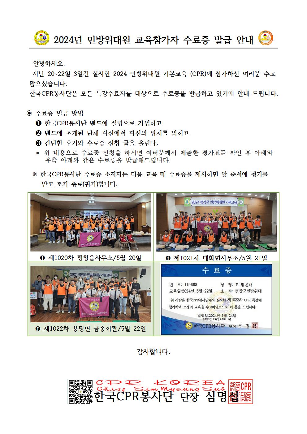 22일 평창군 용평면 금송회관에서 '2024 평창군 민방위대원 기본교육' 대상자로 제1022차 CPR특강을 실시했다.