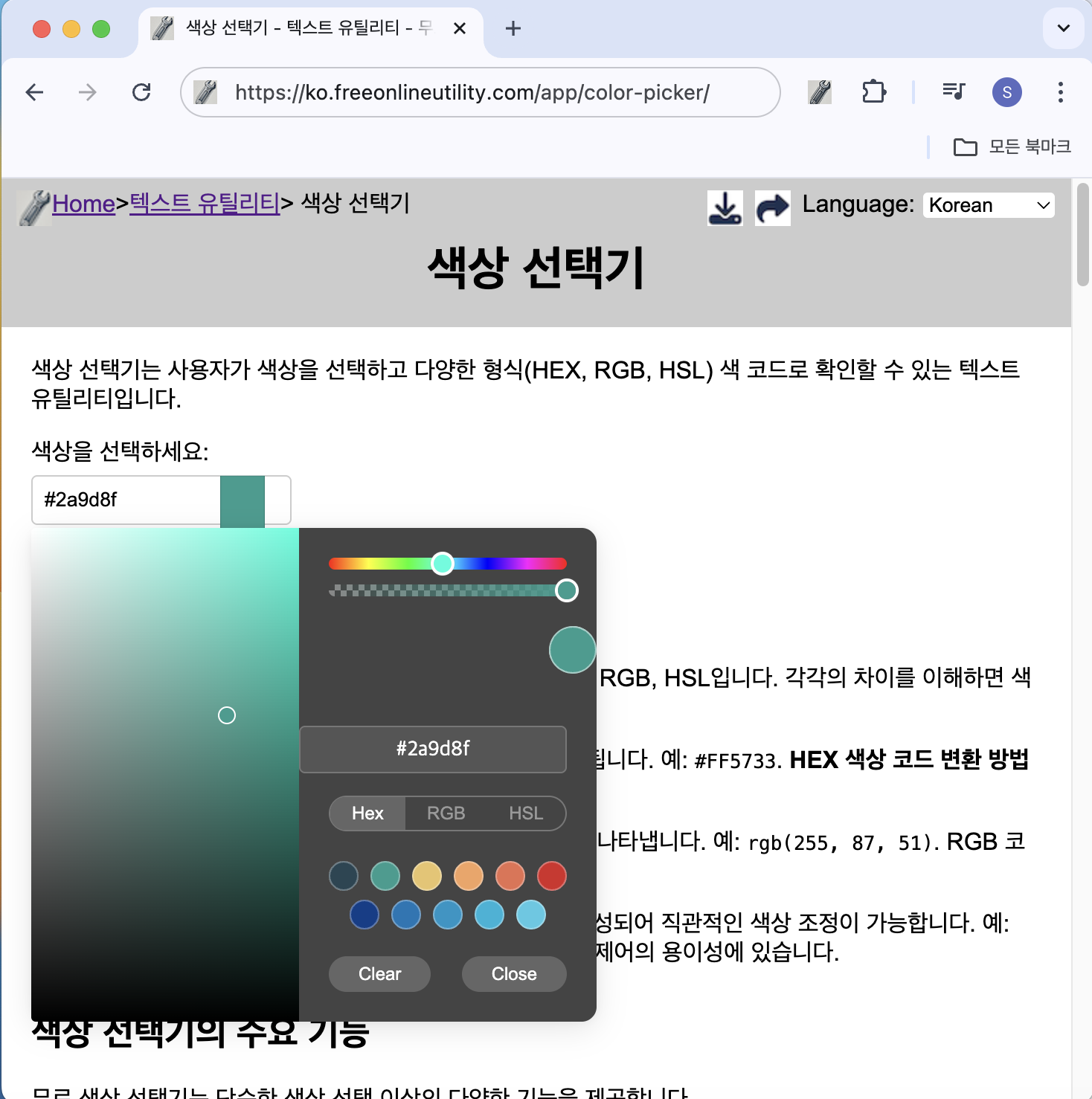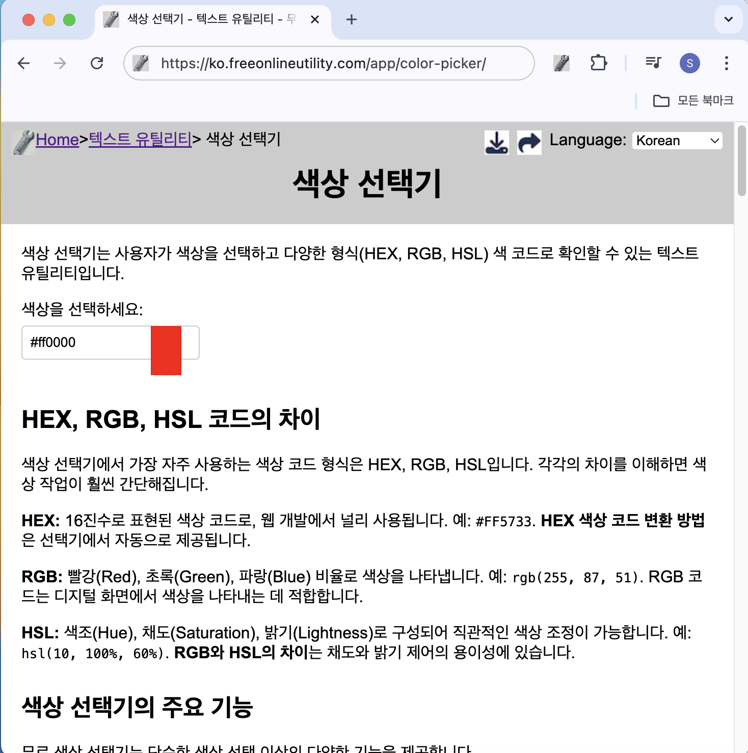 - HEX, RGB, HSL 코드 변환: 실시간 변환 가능.