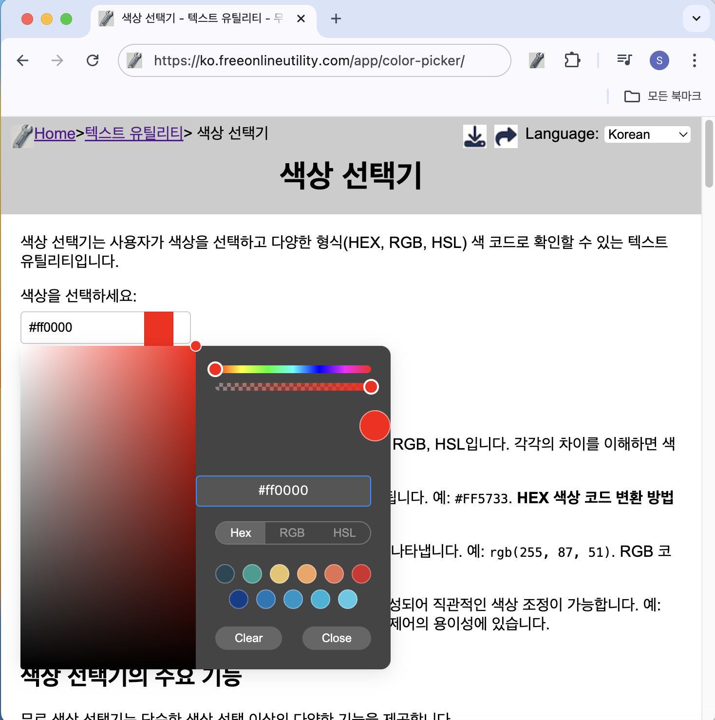 색상 선택기(Color Picker)는 색상을 시각적으로 선택하고 다양한 코드 형식(HEX, RGB, HSL 등)으로 변환할 수 있는 무료 온라인 도구입니다.