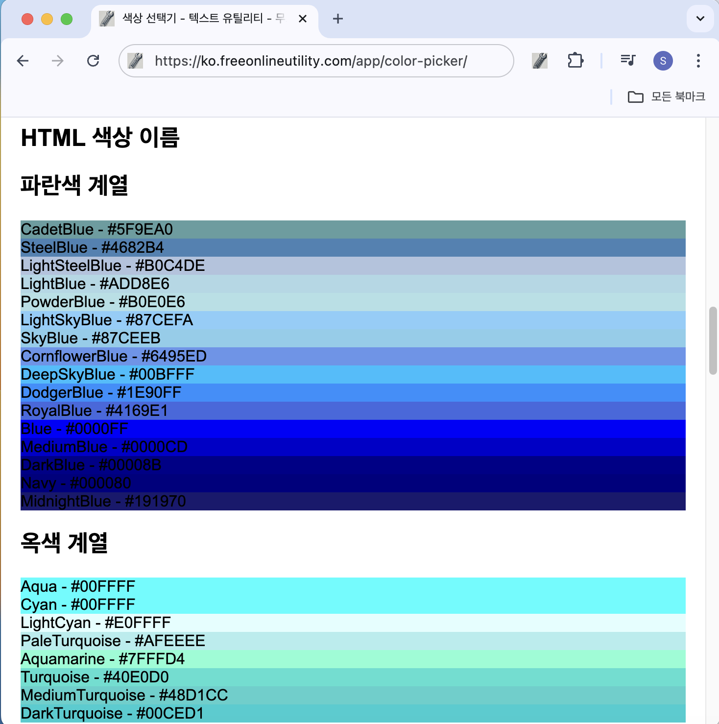- HSL 색상 코드: 색조(Hue), 채도(Saturation), 밝기(Lightness)를 통해 직관적으로 색상을 조정할 수 있습니다. 예: hsl(10, 100%, 60%).