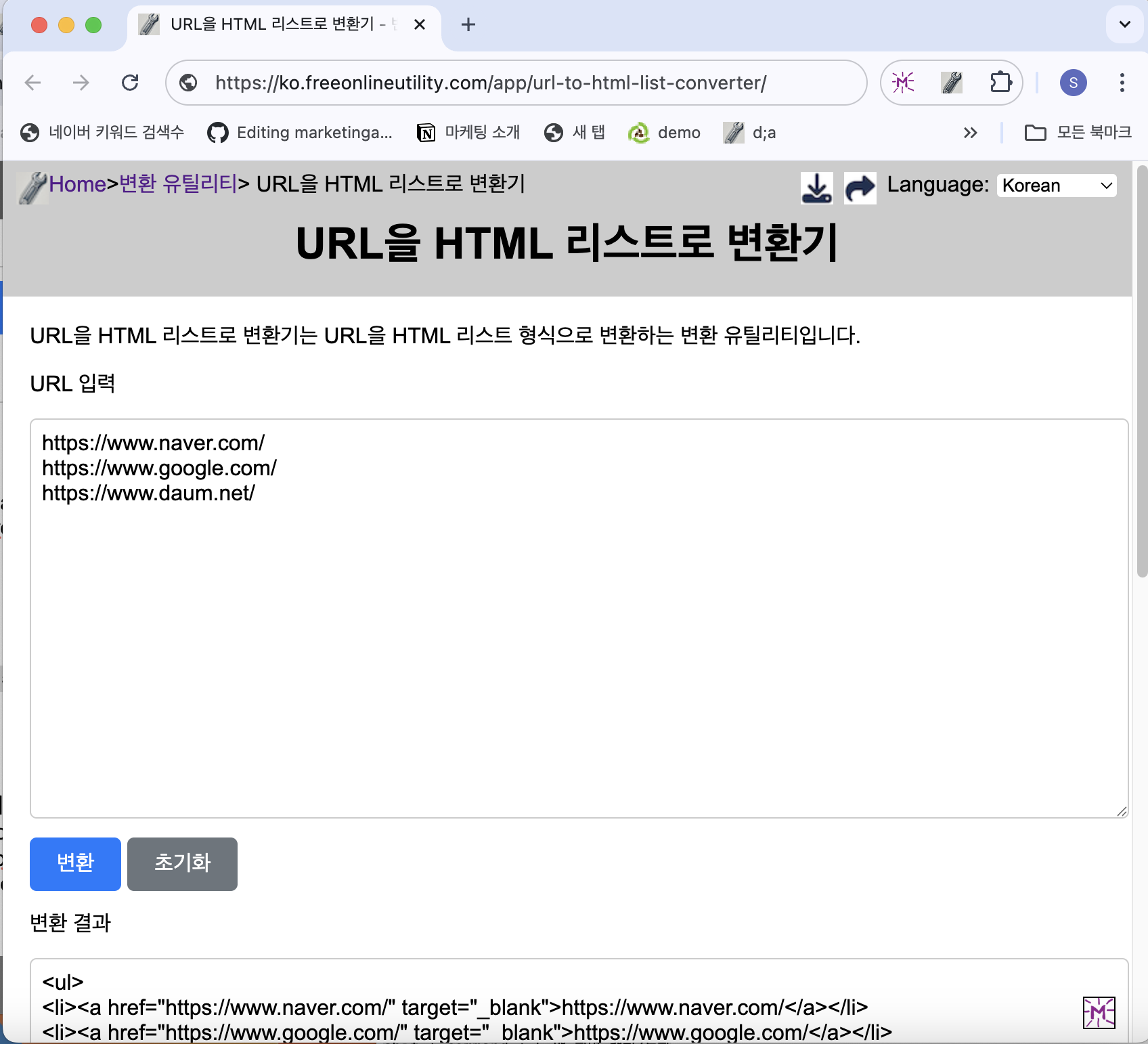 - "변환" 버튼을 클릭하면 HTML 리스트 형식으로 자동 변환됩니다.