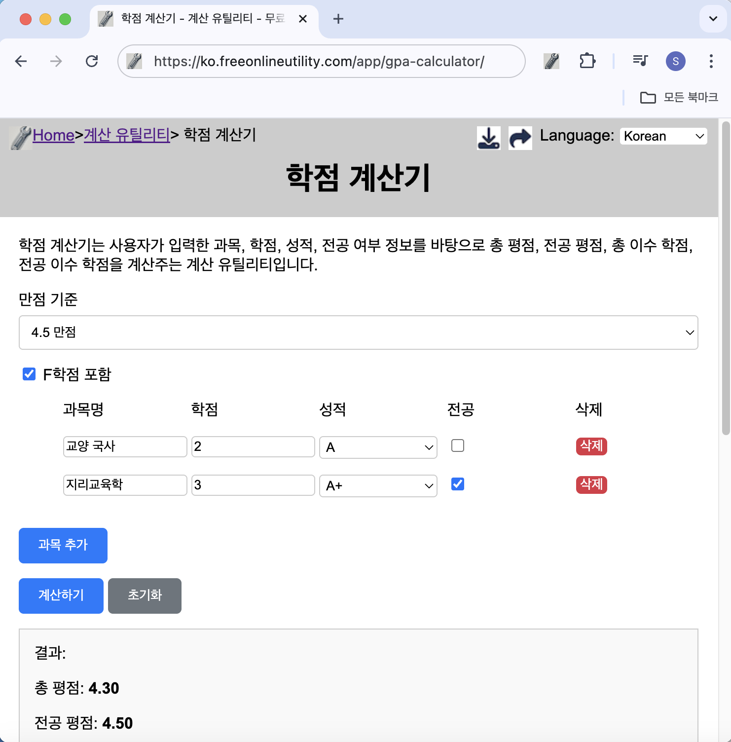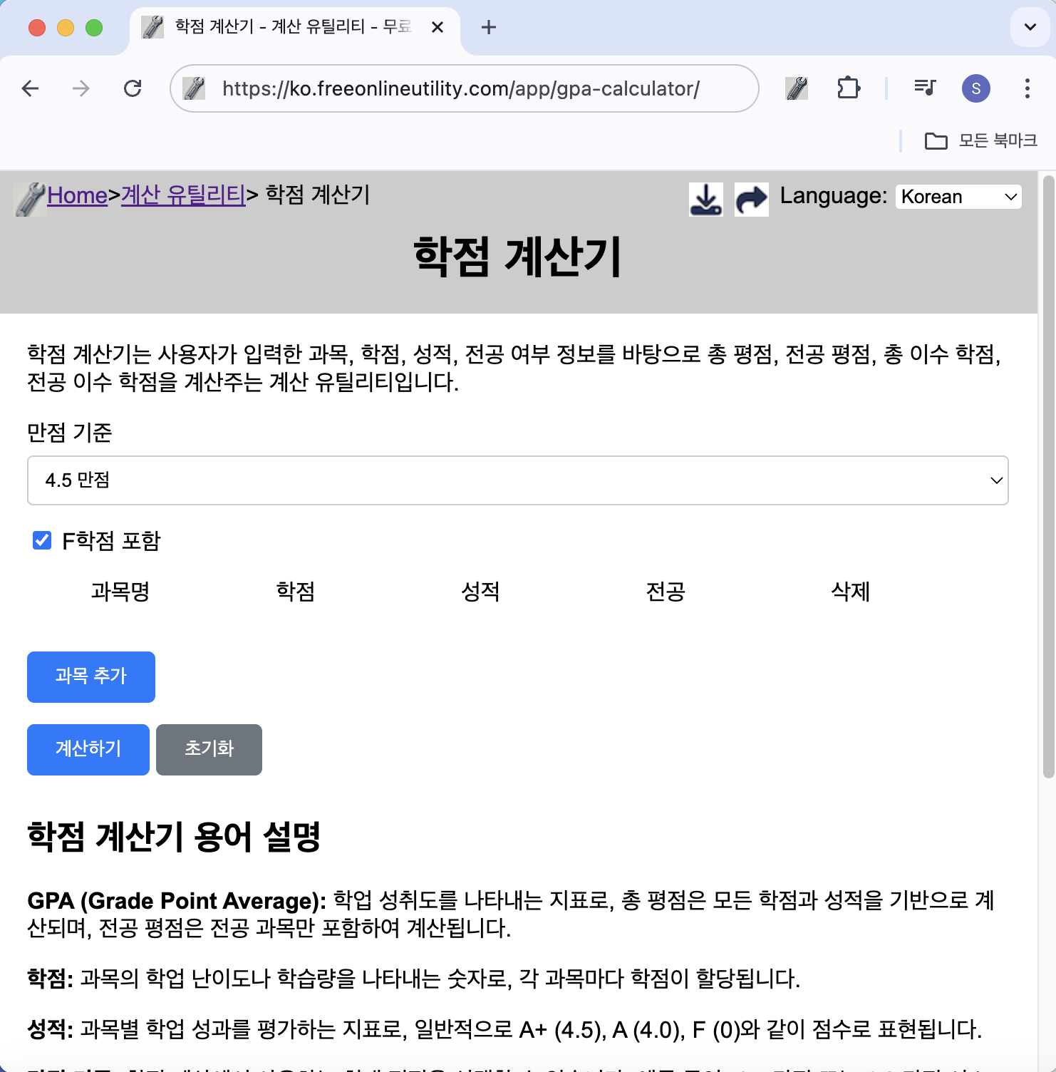 학점 계산이 필요하다면 학점 계산기를 활용해 보세요! 쉽고 빠르게 결과를 확인할 수 있습니다.