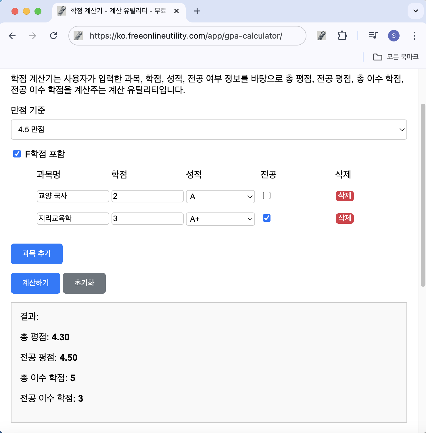 - F학점 제외: 성적이 0(F)인 과목은 계산에서 제외.