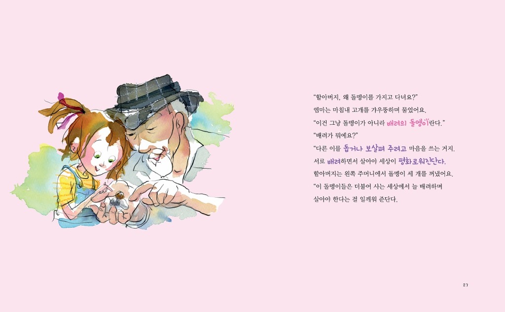 세상은 혼자 살아갈 수 있는 곳이 아닙니다. 사람과 사람이, 사람과 자연이 공존하며 더불어 돕고 살아가는 곳이지요. 이 책에서 할아버지는 언제나 주머니에 돌멩이 세 개를 넣고 다닙니다. 이 돌멩이에는 늘 어디서나 다른 사람을 생각하고, 배려를 실천하려는 할아버지의 마음가짐이 담겨 있지요. 어린이 독자들도 이 책을 통해 다른 사람을 배려하는 마음을 배우고, 그로써 세상을 아름답게 가꾸어 나가기를 바랍니다.