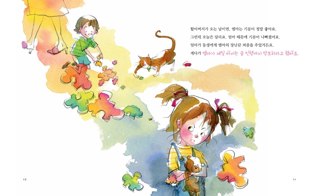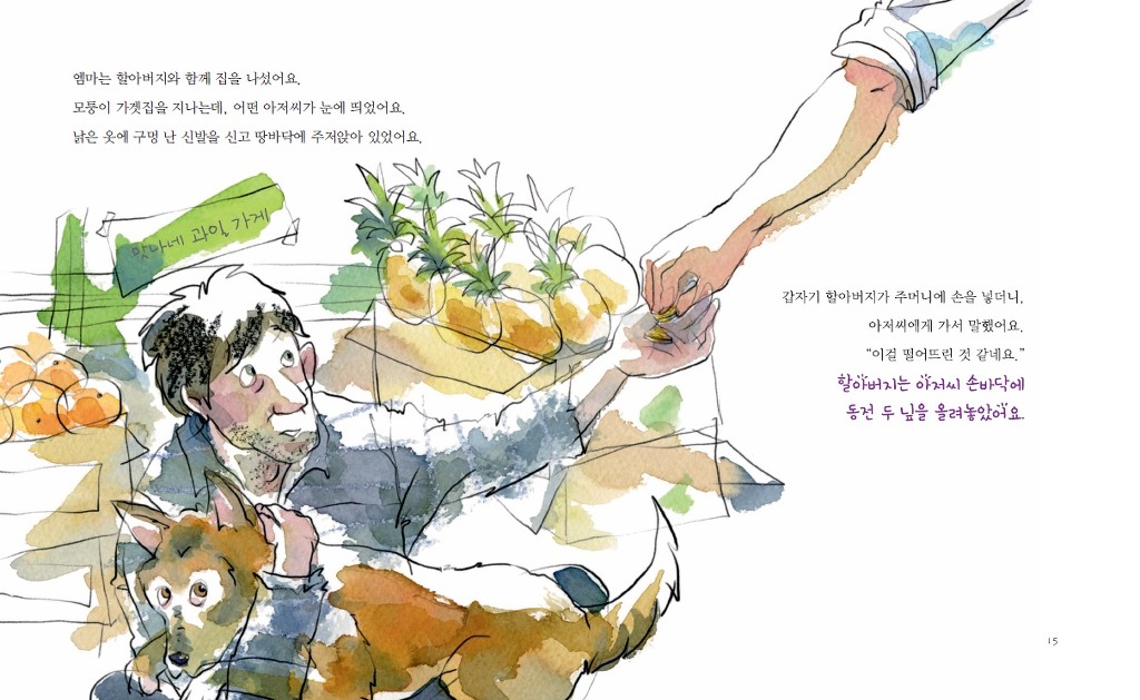 엠마는 엄마 때문에 입이 잔뜩 나왔습니다. 엄마가 동생에게 아끼는 곰 인형을 양보하라고 했거든요. 토라진 엠마에게 할아버지가 산책을 가자고 합니다. 그렇게 따라나선 산책길에서 엠마는 할아버지를 보고 고개를 갸우뚱합니다. 할아버지의 행동들이 이해가 가지 않았거든요.