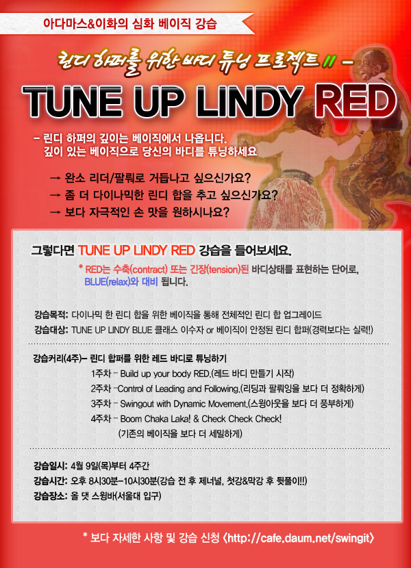 [스크랩] [강습][아다마스&이화의 TUNE UP LINDY - RED] 린디하퍼를 위한 바디튜닝 프로젝트!! 심화 베이직 강습!! 작성자love virus|작성시간09.03.25|조회수6 목록 댓글 0 글자크기 작게가 글자크기 크게가 다음검색 스크랩 원문 : Adamas의 스윙 잇!! 현재 게시글 추가 기능 열기 북마크 공유하기 신고 센터로 신고 댓글 댓글 0 댓글쓰기 답글쓰기 댓글 리스트