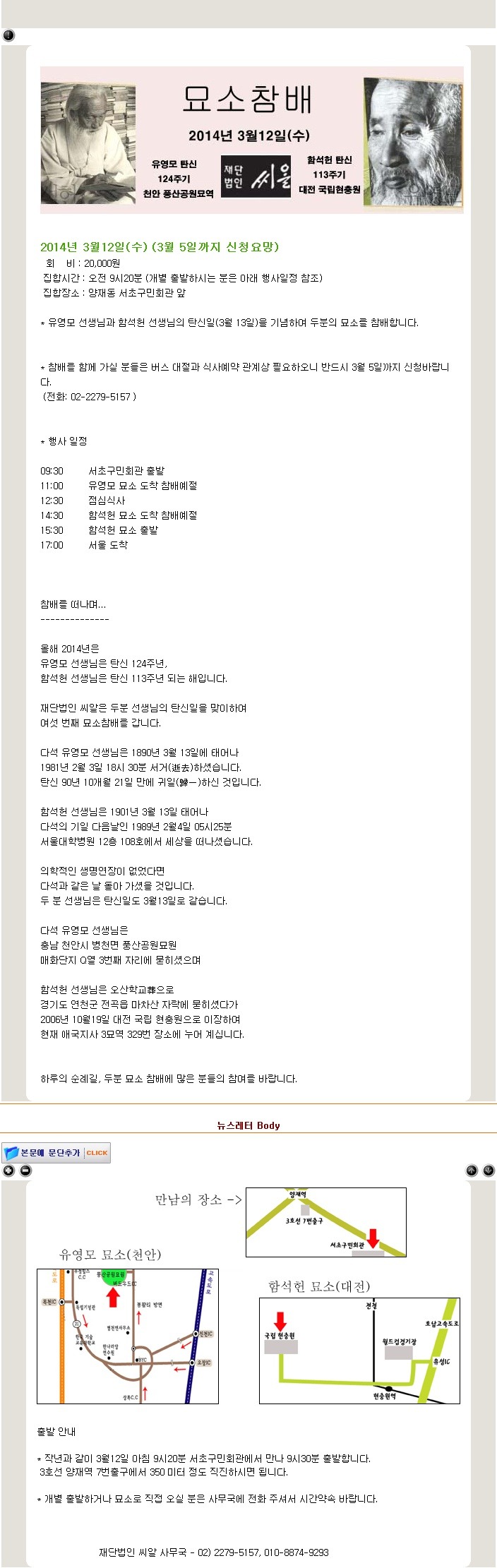 2014년 묘소참배 소식 알립니다. 작성자씨알재단|작성시간14.03.03|조회수44 목록 댓글 0 글자크기 작게가 글자크기 크게가 다음검색 현재 게시글 추가 기능 열기 북마크 공유하기 신고 센터로 신고 댓글 댓글 0 댓글쓰기 답글쓰기 댓글 리스트