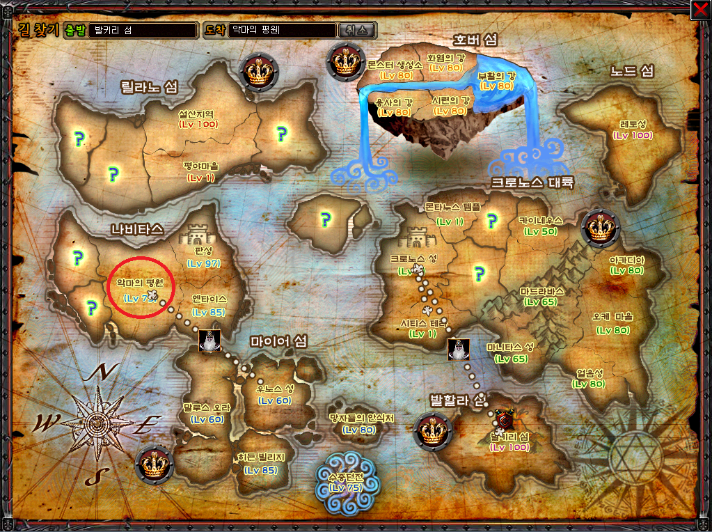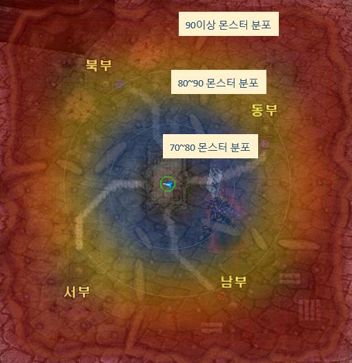 지도 정중앙을 중심으로 멀어질 수록 더욱 강력한 몬스터가 포진 해 있으니 단단히 준비 후 사냥을 시작 해 주세요.