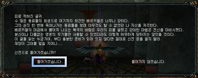 3. 30마리의 몬스터를 모두 처리하고 나면 베르키엘이 소환됨과 동시에 캐릭터들이 베르키엘 앞으로 강제 이동 됩니다. 베르키엘 또한 10분안에 처치해야 합니다!