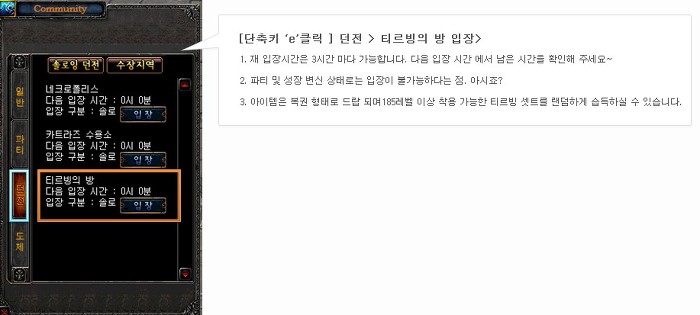 하지만 그래도 솔로잉 던전을 처음 진행해 보는 플레이어 분들이 있을 수 있으니 하나하나 진행 방법을 알려드리도록 하겠습니다. 단축키 ‘E’ 키를 눌러 커뮤니티 창을 열어보세요.