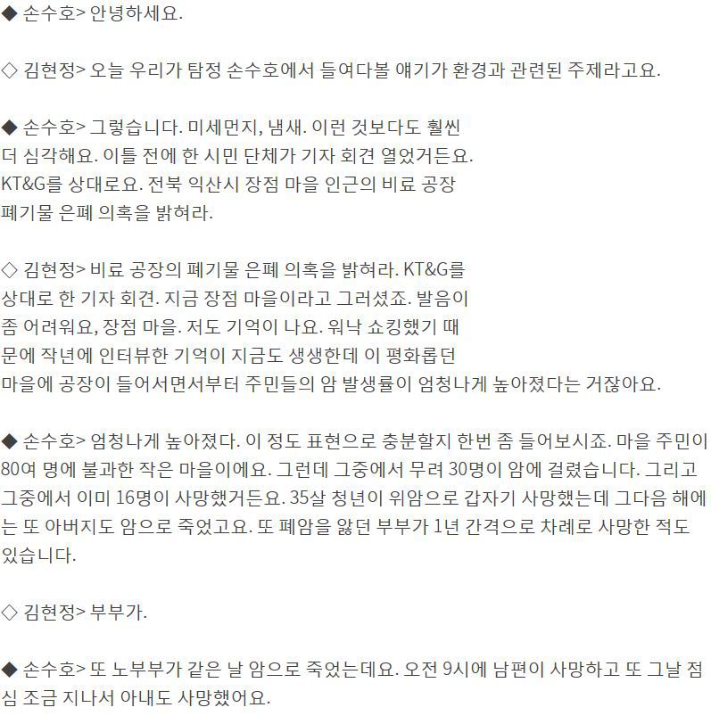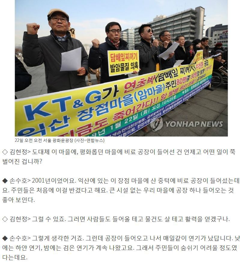 ◇ 김현정> 비료 공장의 폐기물 은폐 의혹을 밝혀라. KT&G를 상대로 한 기자 회견. 지금 장점 마을이라고 그러셨죠. 발음이 좀 어려워요, 장점 마을. 저도 기억이 나요. 워낙 쇼킹했기 때문에 작년에 인터뷰한 기억이 지금도 생생한데 이 평화롭던 마을에 공장이 들어서면서부터 주민들의 암 발생률이 엄청나게 높아졌다는 거잖아요.