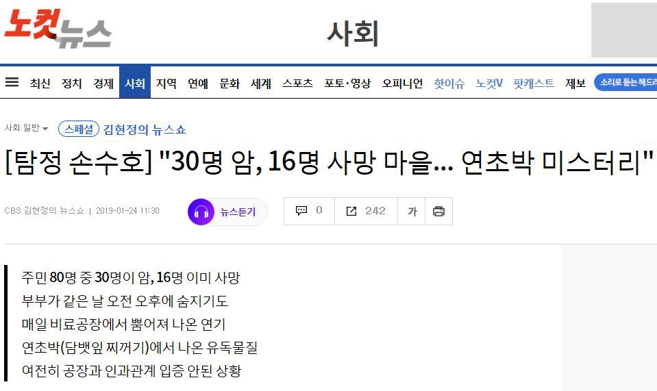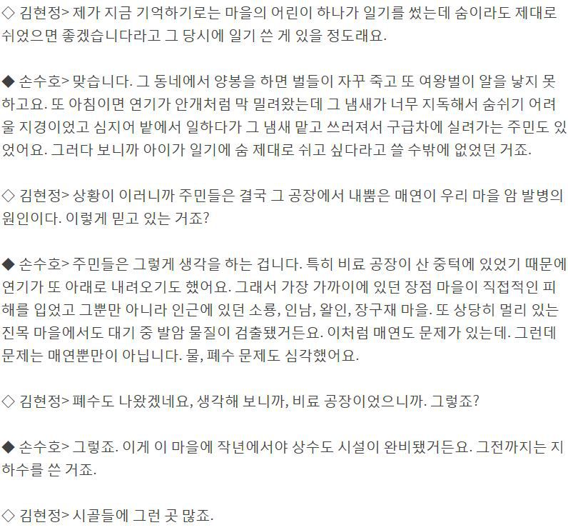 ◇ 김현정> 상황이 이러니까 주민들은 결국 그 공장에서 내뿜은 매연이 우리 마을 암 발병의 원인이다. 이렇게 믿고 있는 거죠?