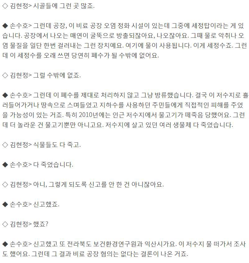 ◆ 손수호> 신고했고 또 전라북도 보건환경연구원과 익산시가요. 이 저수지 물 떠가서 조사도 했어요. 그런데 그 결과 비료 공장 혐의는 없다는 결론이 나온 거죠.