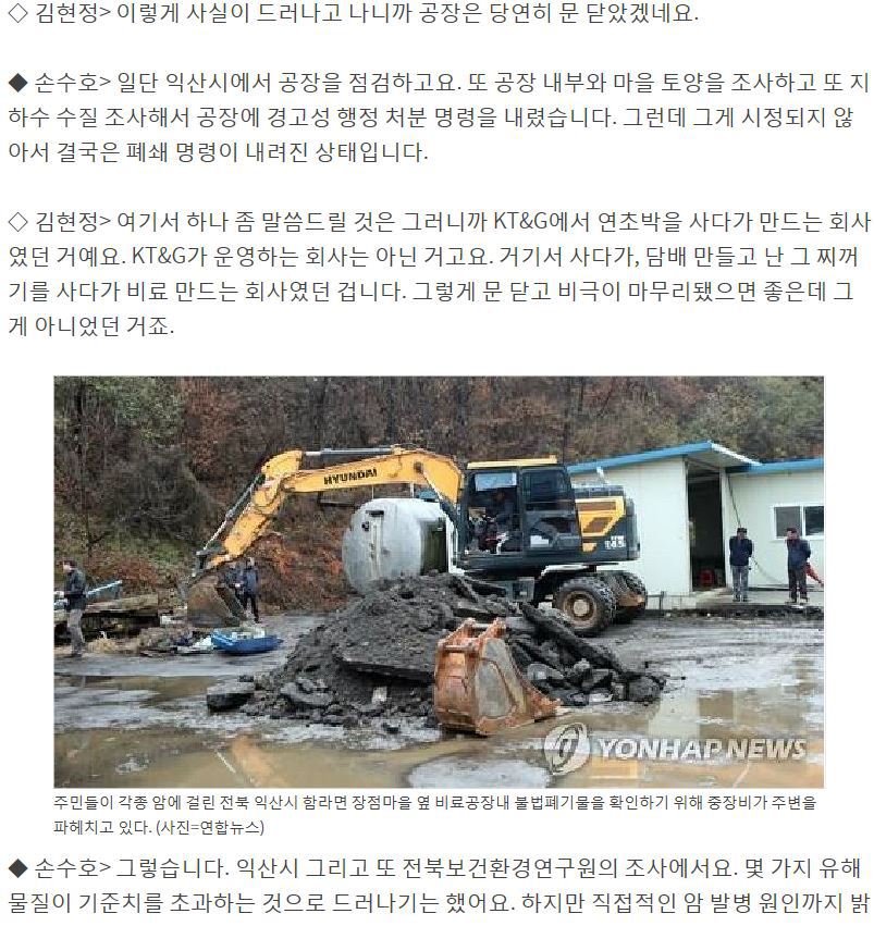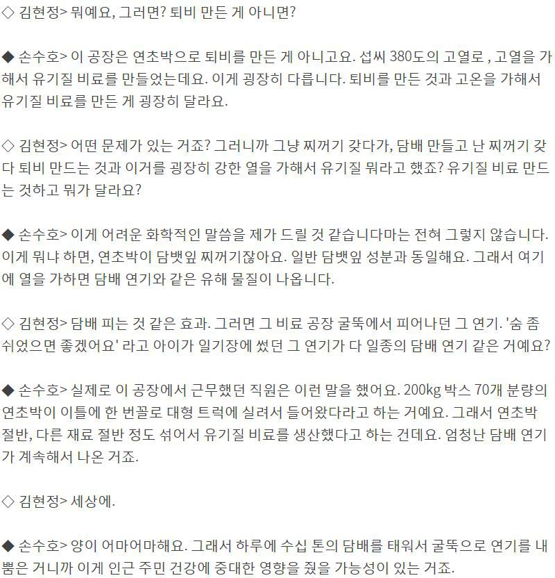 ◇ 김현정> 여기서 하나 좀 말씀드릴 것은 그러니까 KT&G에서 연초박을 사다가 만드는 회사였던 거예요. KT&G가 운영하는 회사는 아닌 거고요. 거기서 사다가, 담배 만들고 난 그 찌꺼기를 사다가 비료 만드는 회사였던 겁니다. 그렇게 문 닫고 비극이 마무리됐으면 좋은데 그게 아니었던 거죠.