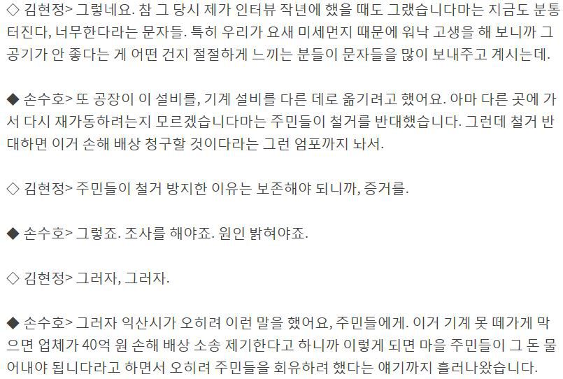 ◆ 손수호> 또 공장이 이 설비를, 기계 설비를 다른 데로 옮기려고 했어요. 아마 다른 곳에 가서 다시 재가동하려는지 모르겠습니다마는 주민들이 철거를 반대했습니다. 그런데 철거 반대하면 이거 손해 배상 청구할 것이다라는 그런 엄포까지 놔서.