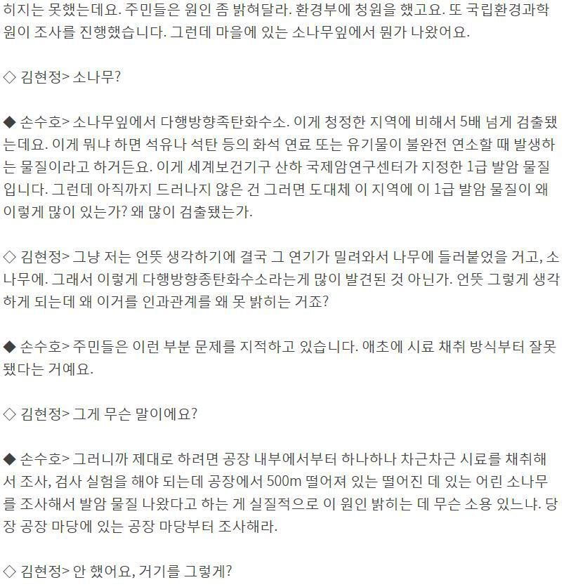 ◆ 손수호> 그러니까 제대로 하려면 공장 내부에서부터 하나하나 차근차근 시료를 채취해서 조사, 검사 실험을 해야 되는데 공장에서 500m 떨어져 있는 떨어진 데 있는 어린 소나무를 조사해서 발암 물질 나왔다고 하는 게 실질적으로 이 원인 밝히는 데 무슨 소용 있느냐. 당장 공장 마당에 있는 공장 마당부터 조사해라.