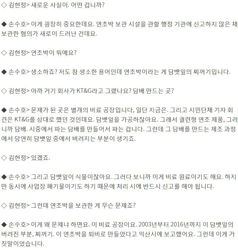◆ 손수호> 문제가 된 곳은 별개의 비료 공장입니다, 일단 지금은. 그리고 시민단체 기자 회견은 KT&G를 상대로 했던 것인데요. 담뱃잎을 가공하잖아요. 그래서 궐련형 연초 제품, 그러니까 담배. 시중에서 파는 담배를 만들어서 파는 겁니다. 그런데 그 담배를 만드는 제조 과정에서 당연히 담뱃잎 중에서 버려지는 부분이 생기죠.