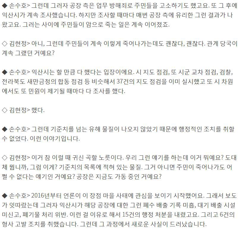 ◆ 손수호> 일단 익산시에서 공장을 점검하고요. 또 공장 내부와 마을 토양을 조사하고 또 지하수 수질 조사해서 공장에 경고성 행정 처분 명령을 내렸습니다. 그런데 그게 시정되지 않아서 결국은 폐쇄 명령이 내려진 상태입니다.
