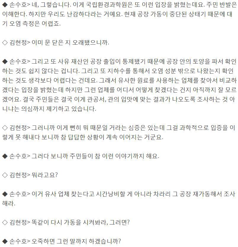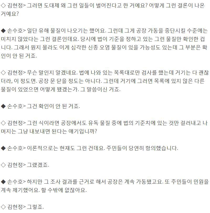 ◆ 손수호> 일단 유해 물질이 나오기는 했어요. 그런데 그게 공장 가동을 중단시킬 수준에는 미치지 않았다는 그런 결론인데요. 당시에 법이 기준을 정하고 있는 그런 물질만 확인한 겁니다. 그래서 뭔지 몰라도 이게 심각한 신종 오염 물질이 있을 가능성도 있는데 그 부분은 확인이 안 된 거죠.