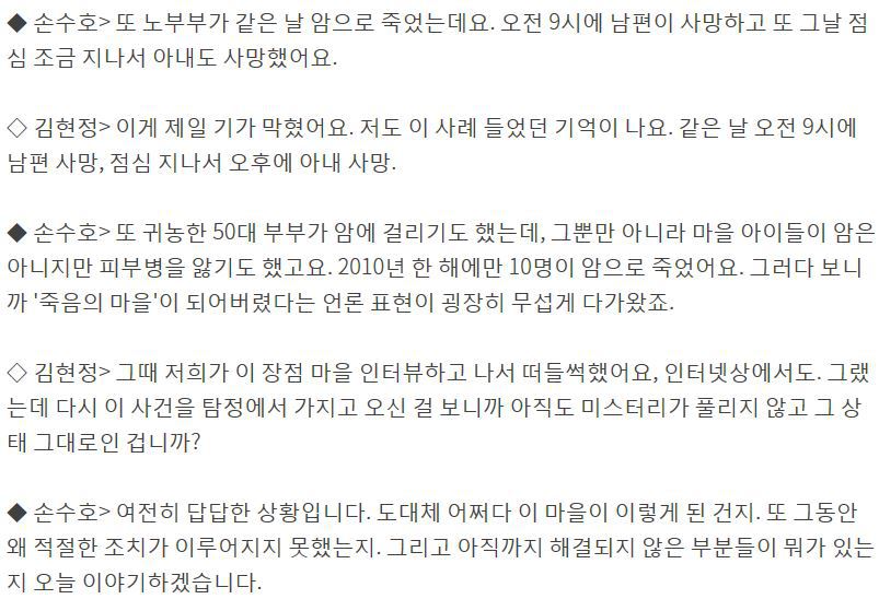 ◆ 손수호> 엄청나게 높아졌다. 이 정도 표현으로 충분할지 한번 좀 들어보시죠. 마을 주민이 80여 명에 불과한 작은 마을이에요. 그런데 그중에서 무려 30명이 암에 걸렸습니다. 그리고 그중에서 이미 16명이 사망했거든요. 35살 청년이 위암으로 갑자기 사망했는데 그다음 해에는 또 아버지도 암으로 죽었고요. 또 폐암을 앓던 부부가 1년 간격으로 차례로 사망한 적도 있습니다.