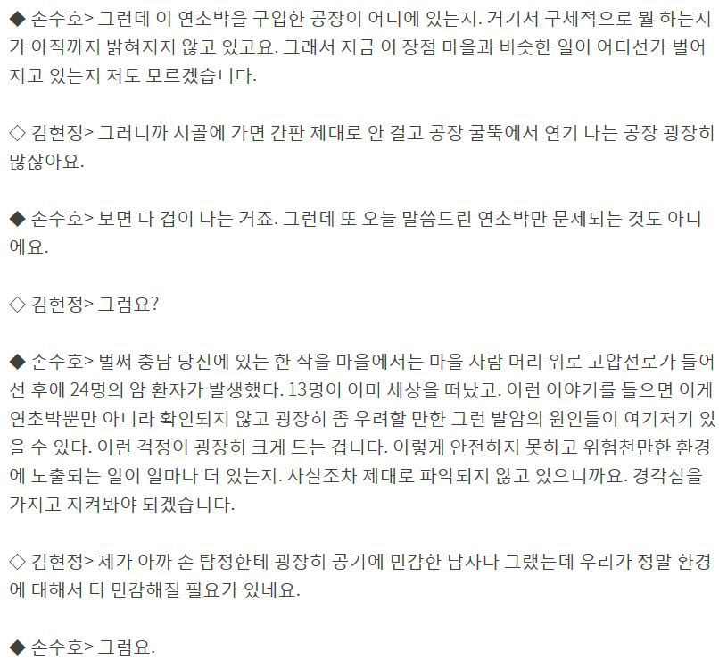 ◆ 손수호> 벌써 충남 당진에 있는 한 작을 마을에서는 마을 사람 머리 위로 고압선로가 들어선 후에 24명의 암 환자가 발생했다. 13명이 이미 세상을 떠났고. 이런 이야기를 들으면 이게 연초박뿐만 아니라 확인되지 않고 굉장히 좀 우려할 만한 그런 발암의 원인들이 여기저기 있을 수 있다. 이런 걱정이 굉장히 크게 드는 겁니다. 이렇게 안전하지 못하고 위험천만한 환경에 노출되는 일이 얼마나 더 있는지. 사실조차 제대로 파악되지 않고 있으니까요. 경각심을 가지고 지켜봐야 되겠습니다.