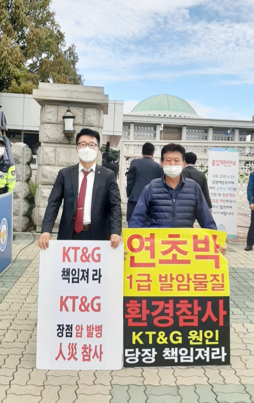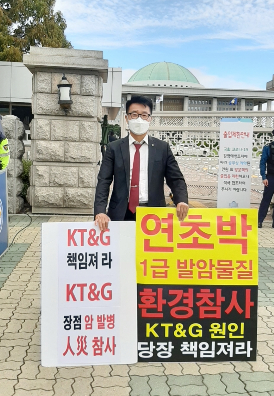 | “연초박” 원인 “KT&G 백복인 사장” 국정감사 증인채택 촉구 - 농업진흥청 7번 점검에도“이상 없슴” “부실점검 책임” 면할길 없다 14일(목) 오전 여의도 국회 앞에서 암이 집단으로 발병한 전북 익산 장점마을 주민대책위(위원장 최재철), 환경단체 글로벌에코넷(상임회장 김선홍) 등 시민단체들은 마을 주민 90여중 40명 암 발병, 17명 사망, 23명 투병 중인 장점마을은 KT&G에서 공급한 연초박과 농진청이 총 7차례 점검에도 “이상 없슴” 부실점검으로 환경재앙이 발생했다며 기자회견을 개최했다. 기자회견에서 주민대책위와 시민단체들은 지난 “2020년 농촌진흥청 연구과제 완결 최종보고서에서 국립농업과학원이 2020년2월부터 2020년12월까지 시행한 ‘연초박 퇴비 공정 중 유해 물질(TSNAS) 분석연구’결과에 따르면 연초박을 혼합 부숙유기질비료 안전성을 평가하기 위해 제공박은 연초박(100%)에서 1급 발암물질인 NNN과 NNK가 검출됐다”고 강조했다. 최재철 주민대책위원장은 언론보도에 의하면 더불어민주당 이원택 의원이 농촌진흥청으로부터 제출받은 자료에 따르면 익산 장점마을 사태의 주범인 (유)금강농산을 대상으로 7차례 점검을 실시했음에도, 발암물질의 원인인 불법원료 사용을 적발하지 못한 것으로 밝혀졌다,면서 (유)금강농산은 문제된 불법원료인 연초박을 퇴비원료로 사용하겠다고 신고한 뒤 공장에 반입한 했고, 또한 검찰조사에 의하면 (유)금강농산 공장에는 연초박을 퇴비화하는 시설이 없던 것으로 알려졌다.고 지적했다. 최 위원장은 농촌진흥청이 금강농산 7차례 점검 과정에서 퇴비화 시설의 유무만 확인하고 불법원료를 적발했다면 장점마을 암 집단 발병과 많은 사망자가 발생한 환경재앙을 미연에 방지할 수 있었다, 면서 분노했다. |