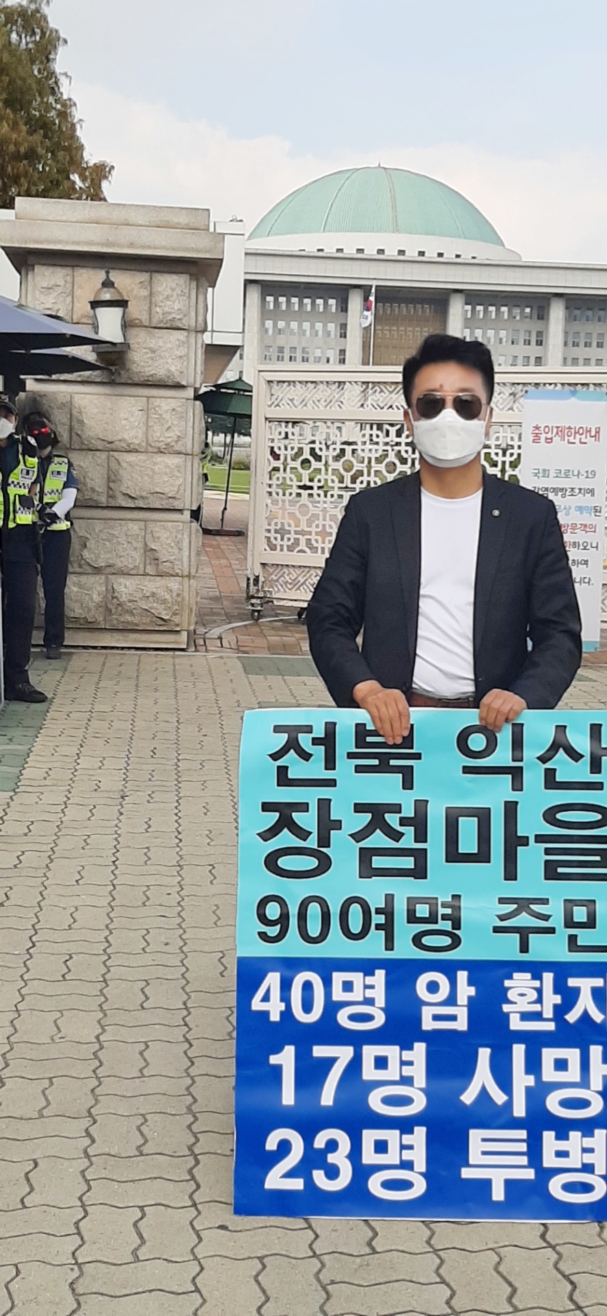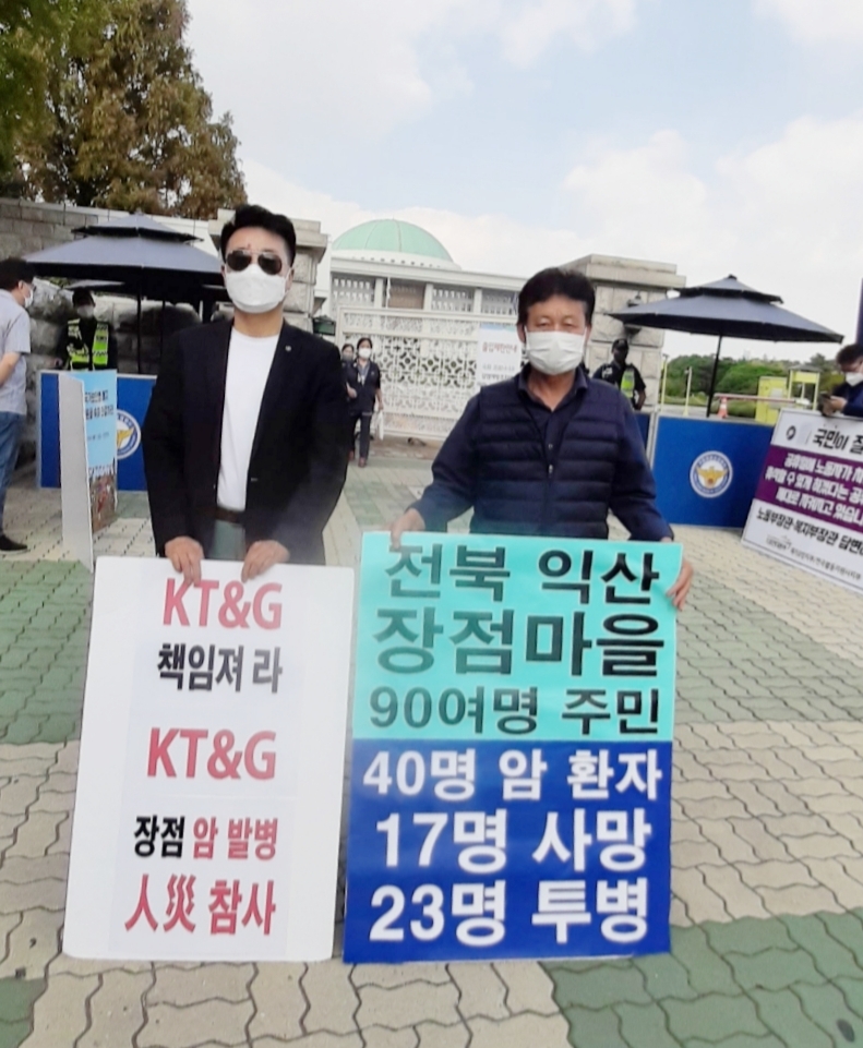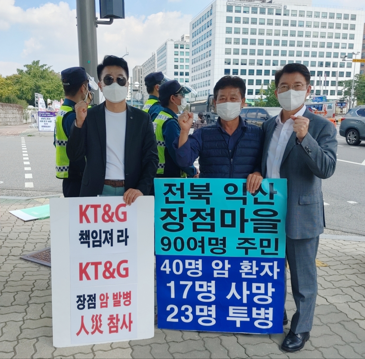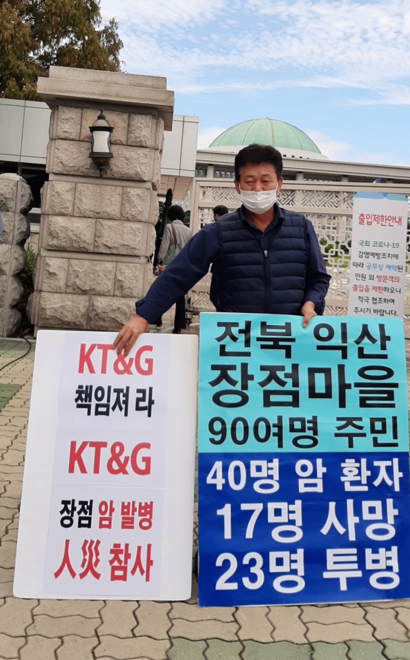 10월14일(목) 오전 여의도 국회 앞에서 암이 집단으로 발병한 전북 익산 장점마을 주민대책위(위원장 최재철), 환경단체 글로벌에코넷(상임회장 김선홍), 최재철 익산 장점마을 주민대책위원장, 김수흥 국회의원은 마을 주민 90여중 40명 암 발병, 17명 사망, 23명 투병 중인 장점마을은 KT&G에서 공급한 연초박과 농진청이 총 7차례 점검에도 “이상 없슴” 부실점검으로 환경재앙이 발생했다며 1인 시위를 개최했다.