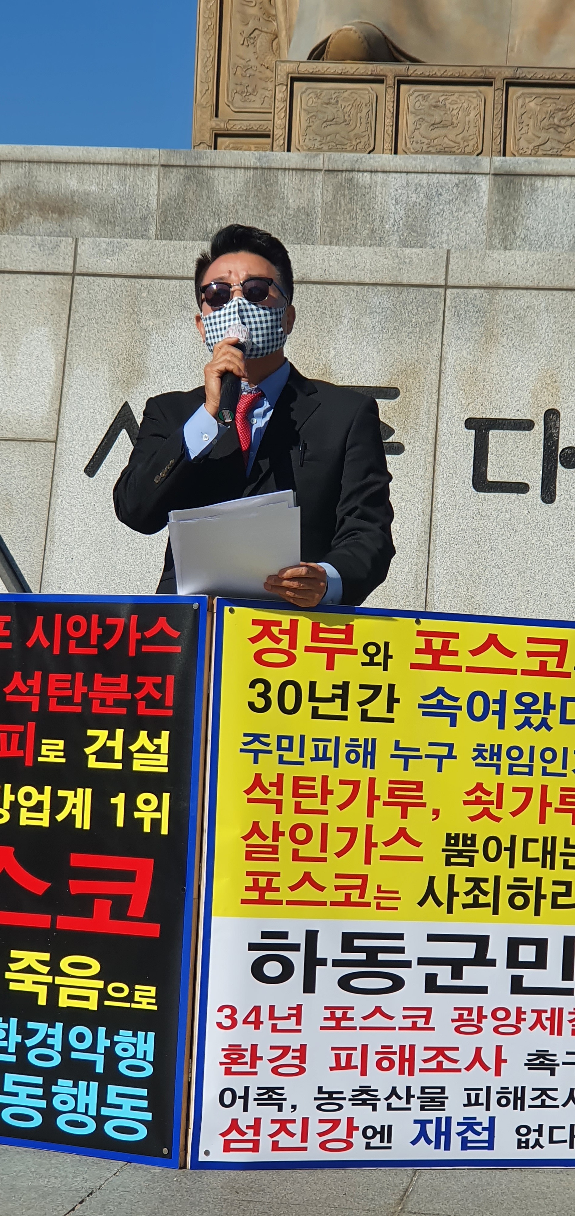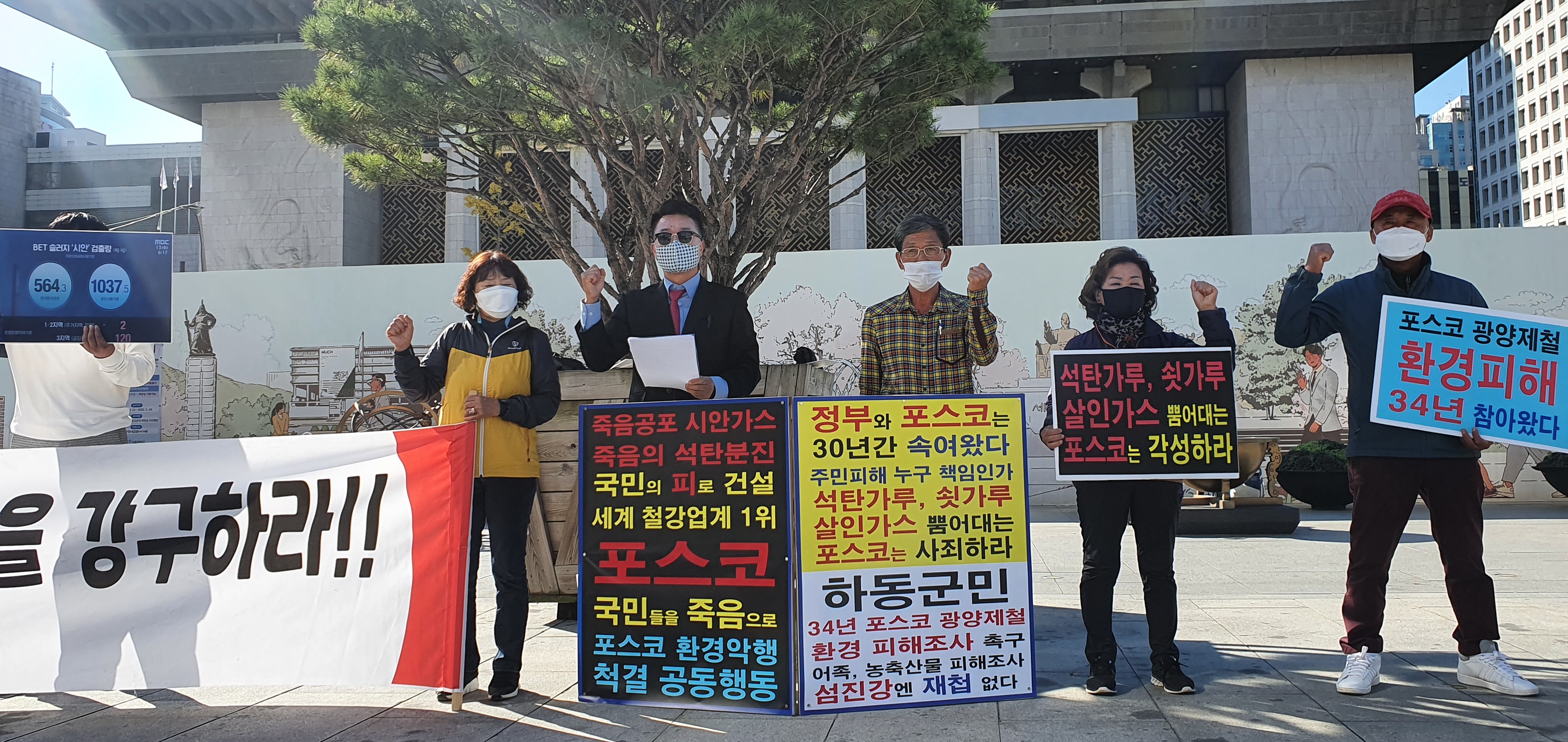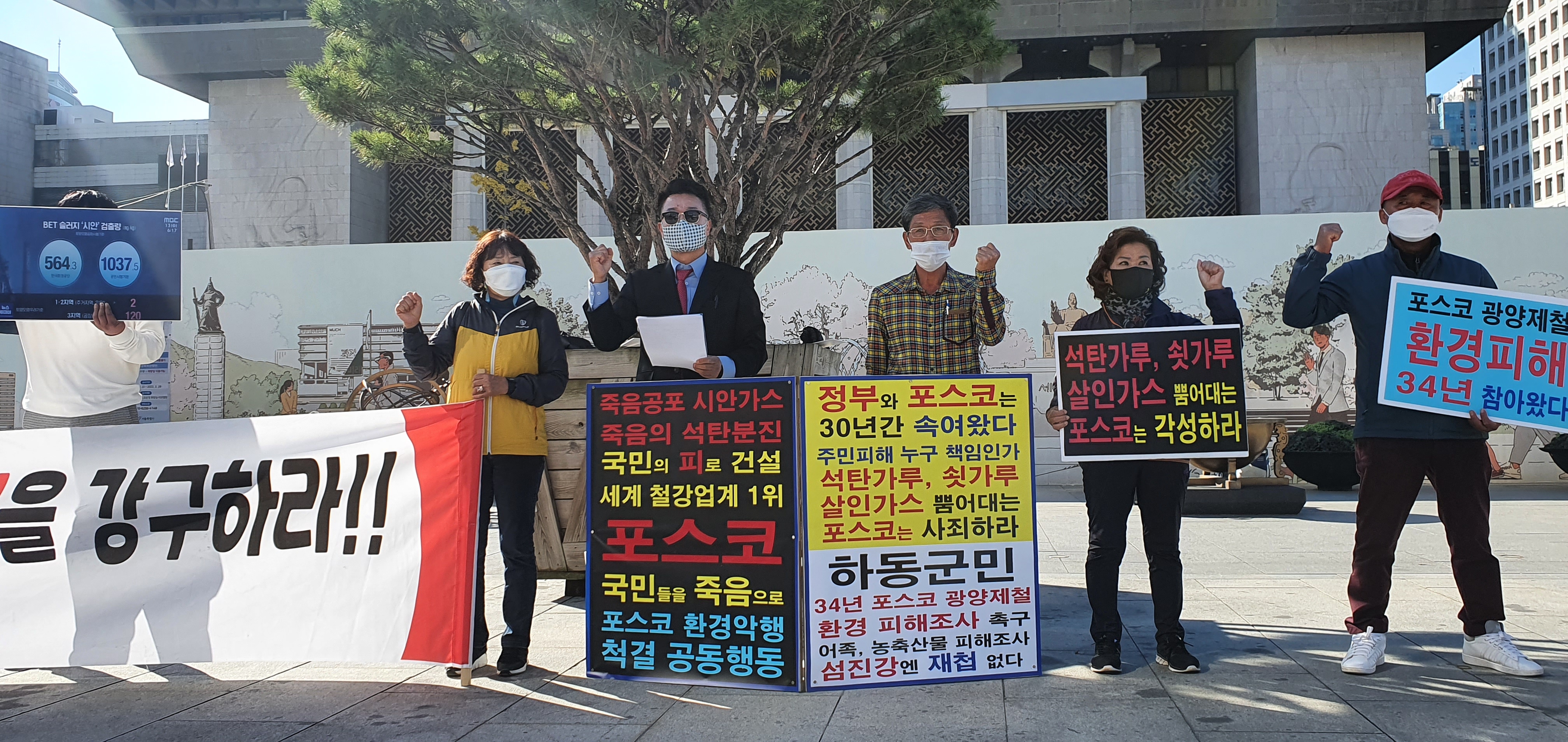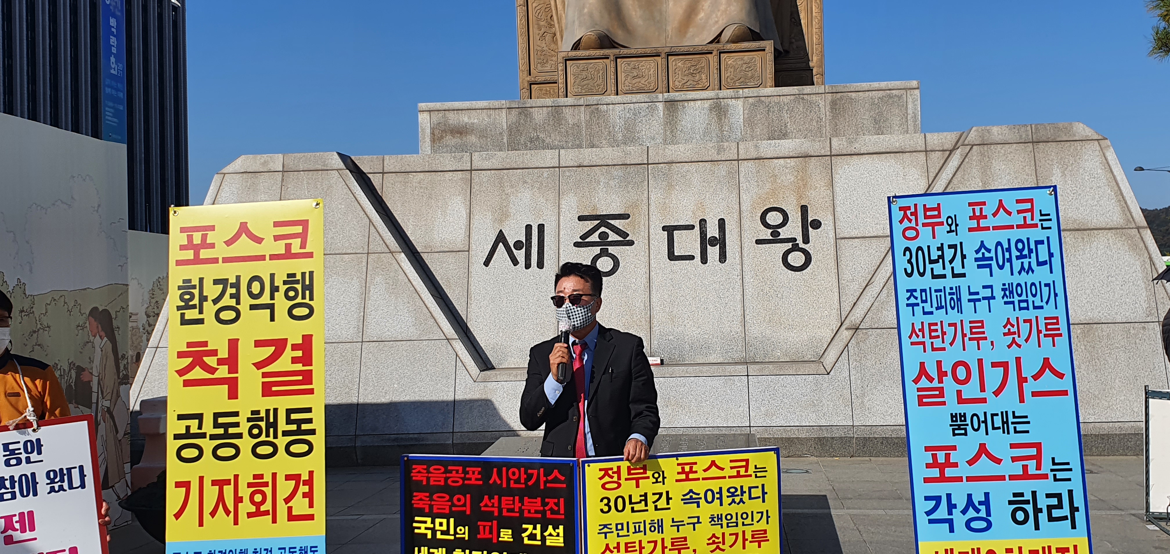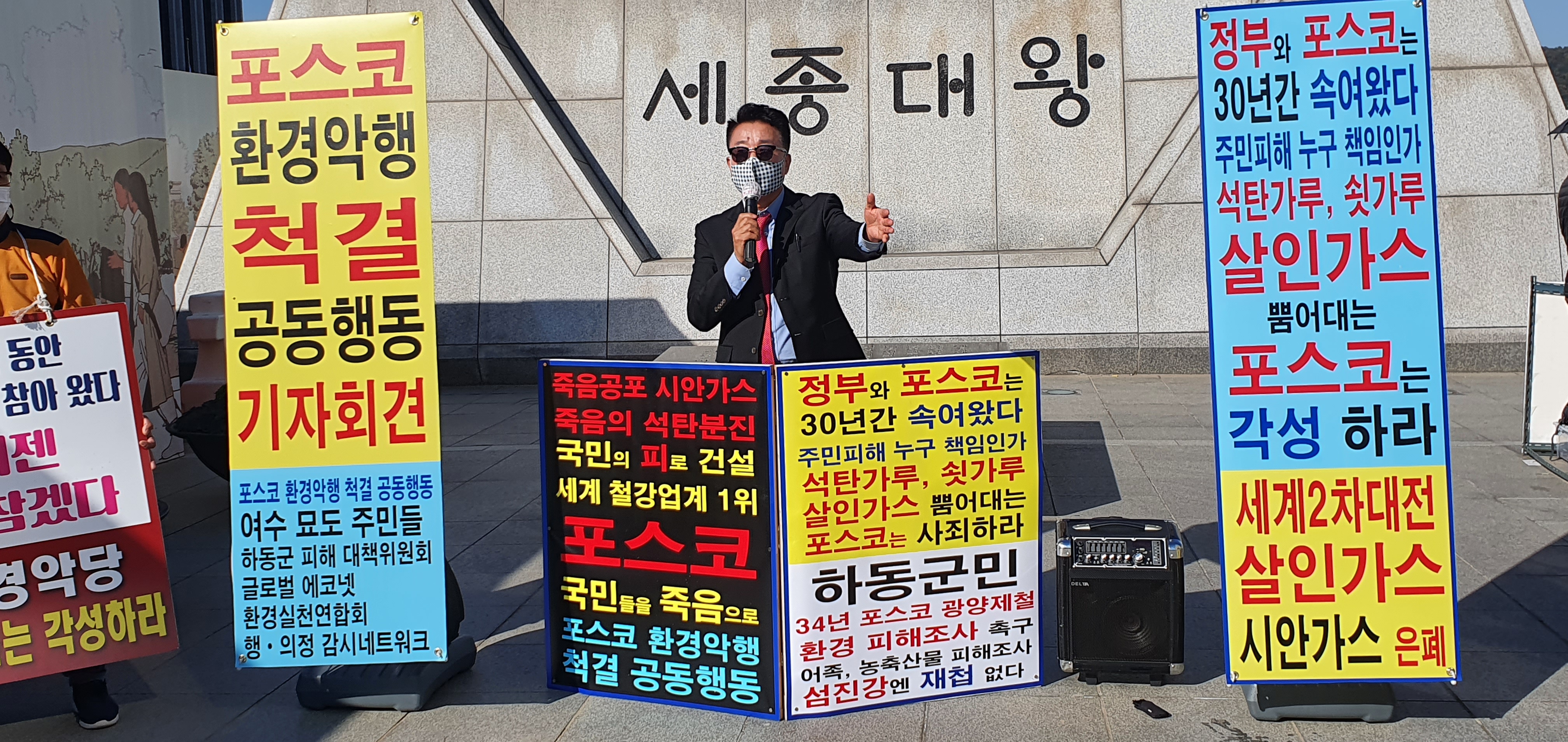 | 포스코 더 이상 국민을 속이지 마라! 광양제철소 슬러지 “독극물 시안 시료당 최대 1천37mg 검출” 토양오염기준 500배 글로벌에코넷, 포스코 광양제철소 “19년, 20년 대기오염물질 발생량 대한민국 1등” 묘도 주민, 주민건강영향조사 촉구 하동군민, 포스코 광양제철소는 34년 피 맺힌 목소리를 똑똑히 들어라! 오는 28일 오후 2시 포스코 환경 악행 척결 공동행동은(이하 포스코 공동행동) 광화문광장 세종대왕상앞에서 포스코 광양제철소의 환경 악행을 규탄하는 기자회견을 개최했다. 이날 포스코 공동행동에는 전남 여수 묘도주민들, 포스코 광양제철소 하동군 피해 대책위원회, 글로벌에코넷, 환경실천연합회, 행·의정 감시네트워크 중앙회 등이 참여 했다. 국민기업이라 불리는 포스코는 1968년에 설립해 1973년 1기 설비 준공 후 많은 발전을 해왔다. 그러나 포스코의 환경개선 노력에도 불구하고 환경의 취악한 문제가 2021년 국회 환경노동위 국정감사에서 진실이 들어 나면서 포스코는 환경 악행기업의 오명이 붙어졌다. 노웅래 의원실이 지난 8월 17일 광양제철소의 슬러지 시료당 최대 1천37mg의 독극물 시안이 검출 토양오염기준 500배에 달한 것으로 밝혀졌다. 이에 묘도 주민들은 다른 지역과 비교할 때 암 환자가 많이 발생했다는 결과가 지난 국회 환경노동위원회 국정감사에서도 밝혀졌다. 우리 주민들은 30년 동안 석탄가루와 쇳가루로 인해 채소도 심어 먹을 수 없었고 창문도 열어놓을 수 없는 고통속에 살아왔다. 30년간 주민들을 속여온 정부와 포스코는 주민 건강을 위해 주민건강영향조사를 실시하고 대책요구을 촉구하고 나섯다. 강정현 포스코 광양제철소 하동군 피해 대책위원회 공동위원장은 우리 하동군민들은 포스코 광양제철소가 이곳에 들어선 후 34년간 참아왔던 울분을 포스코 광양제철소측에 전달하기 위해 이자리에 섰다면서, 포스코 광양제철소와 하동군과의 거리로 1.7km, 차량으로는 5분밖에 안 걸릴 정도로 가까이 있는 지역을 강조하면서, 그민큼 포스코 광양제철소 운영으로 인한 환경 피해도 직접적으로 받을 수밖에 없었다고 주장했다. 강 공동위원장은 포스코 광양제철소는 우리 하동군민과 함께 가기 위해서는 우리 군 전체 환경피해조사는 물론 농축산물, 섬진강 등 기타 여러 분야별 피해 조사를 하여 그 대책을 강구할 것을 강력히 촉구하면서, 포스코 광양제철소는 우리 군민들의 34년 한맺힌 목소리를 똑똑히 듣고 진정으로 지역과 상생하는 글로벌 일류 기업으로나시 한번 거듭날 것을 강조했다. 김선홍 글로벌에코넷 상임회장은 포스코 광양제철소는 과거에도 지역에서 폐수배출 등으로 과징금 부과 및 대기오염물질 발생으로 지역 주민들 건강권에 큰 영향을 끼친다고 주장했다. 김 회장은 포스코 광양제철소는 2020년 대기오염물질 연간 배출량 통계에 의하면 먼지308,751kg, 황산화물8,558,759kg, 질소산화물10,225,850kg, 염화수소1,699kg 등총 19,095,059kg 발생으로 대기오염물질별 배출량 대한민국 1등 불명예을 기록했다고 지적했다. 특히 16년 5등, 17년 4등, 18년 3등 해마다 대기오염물질 배출량 높아지더니 19년, 20년 1등 드디어 대한민국1등 불명예를 기록하면서 지역 대기오염에 막대한 영향을 끼쳤고, 환경부가 발표한 대기오염물질 감축 정책과 대형 사업장의 적극적인 감축 노력으로 대기오염물질이 지속적으로 감축하고 있다”는 환경정책에 역행하고 있다고 꼬집었다. 행‧의정 감시네트워크 중앙회는 포스코 광양제철소가 발생시킨 먼지, 황산화물, 질소산화물 등 대기환경오염물질이 수십년간 누적되어 지역주민들의 제일 소중한 생명권, 건강권에 막대한 피해영향 끼친 의혹을 제기했다. |