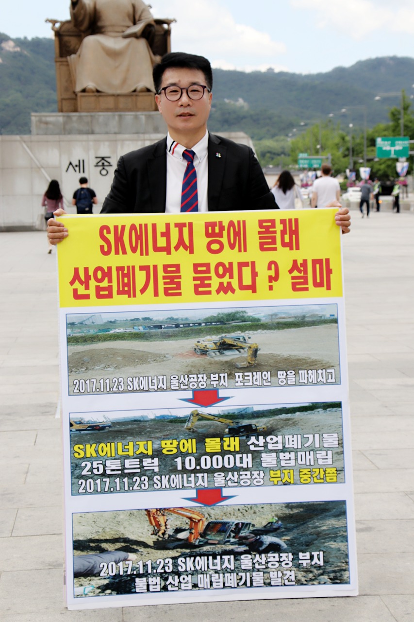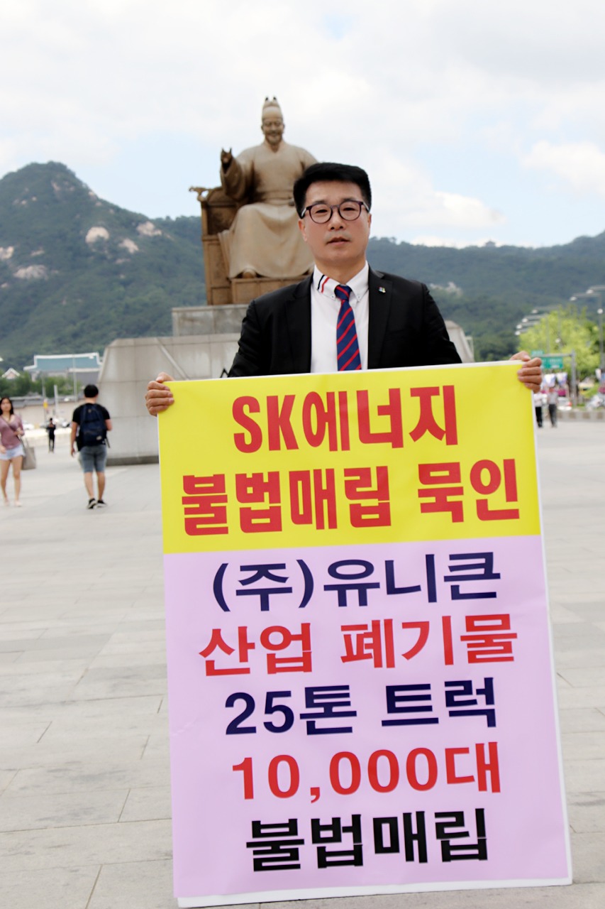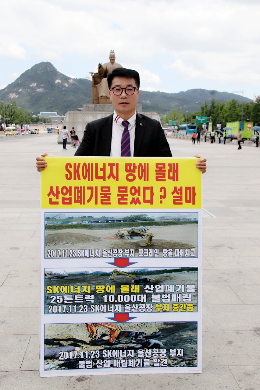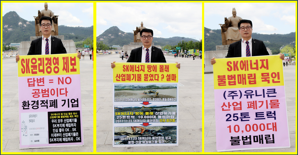 글로벌에코넷 환경적폐 기업 반드시 응징 SK에너지 광화문 1인시위 산업폐기물 불법 매립업체, 고발 및 즉시 원상복구 촉구 공동 기자회견 공익제보자 25톤트럭 10,000여대 엄청난 양, SK에너지 불법매립 침묵은 단순한 묵인인가, 아니면 유니큰과 공범 의혹 |
