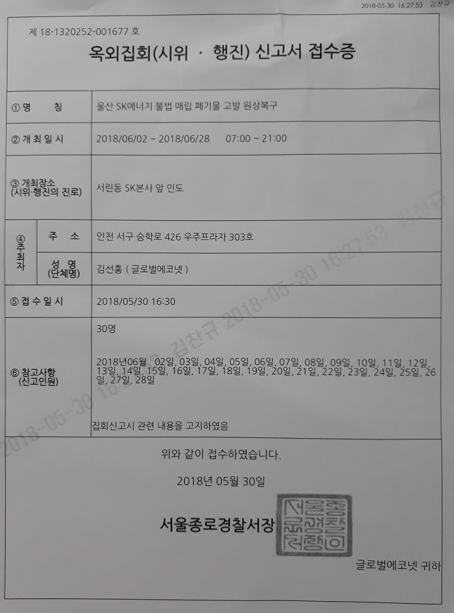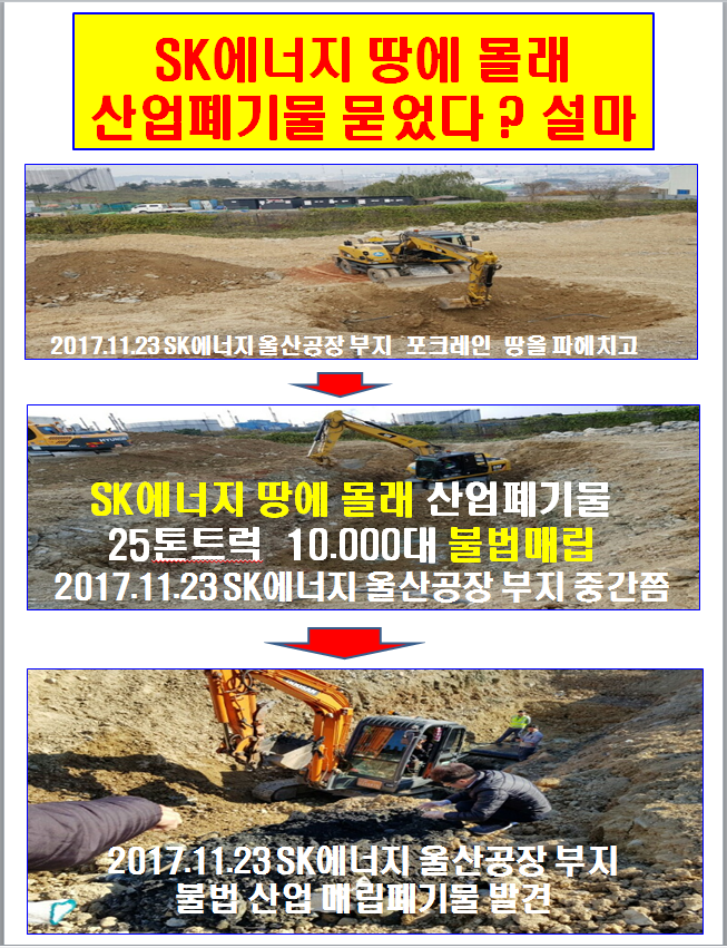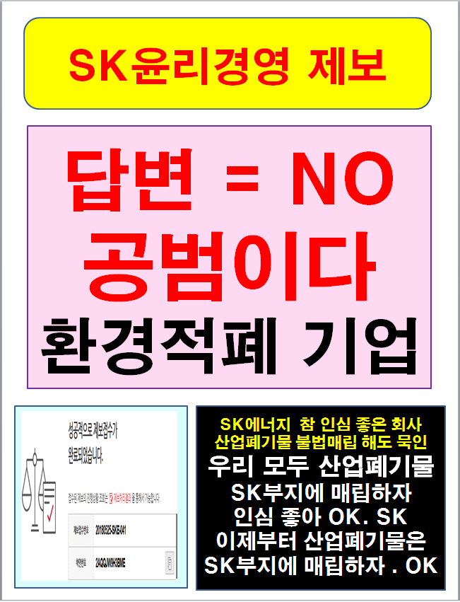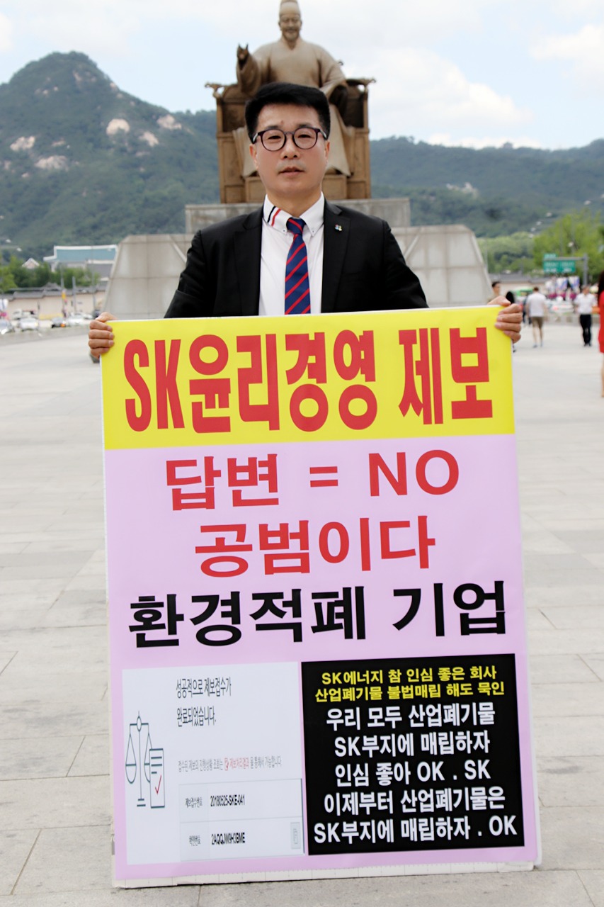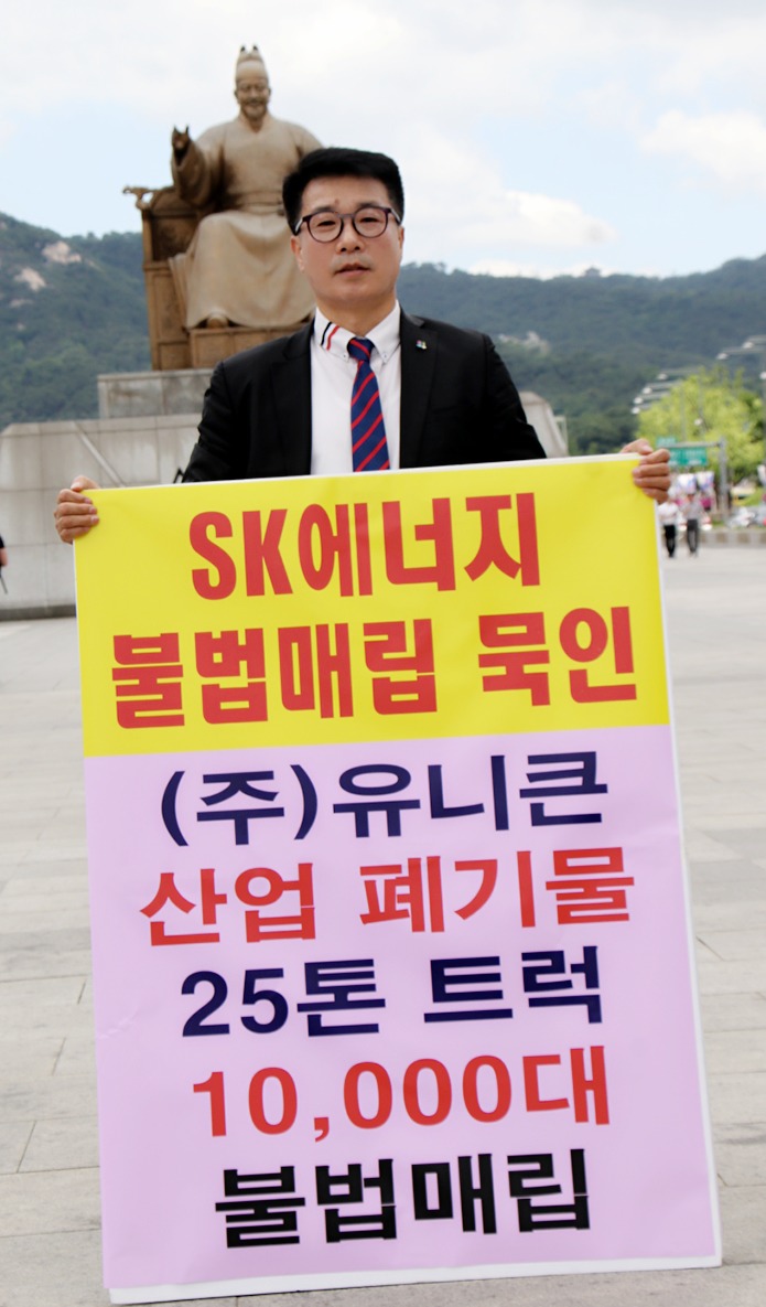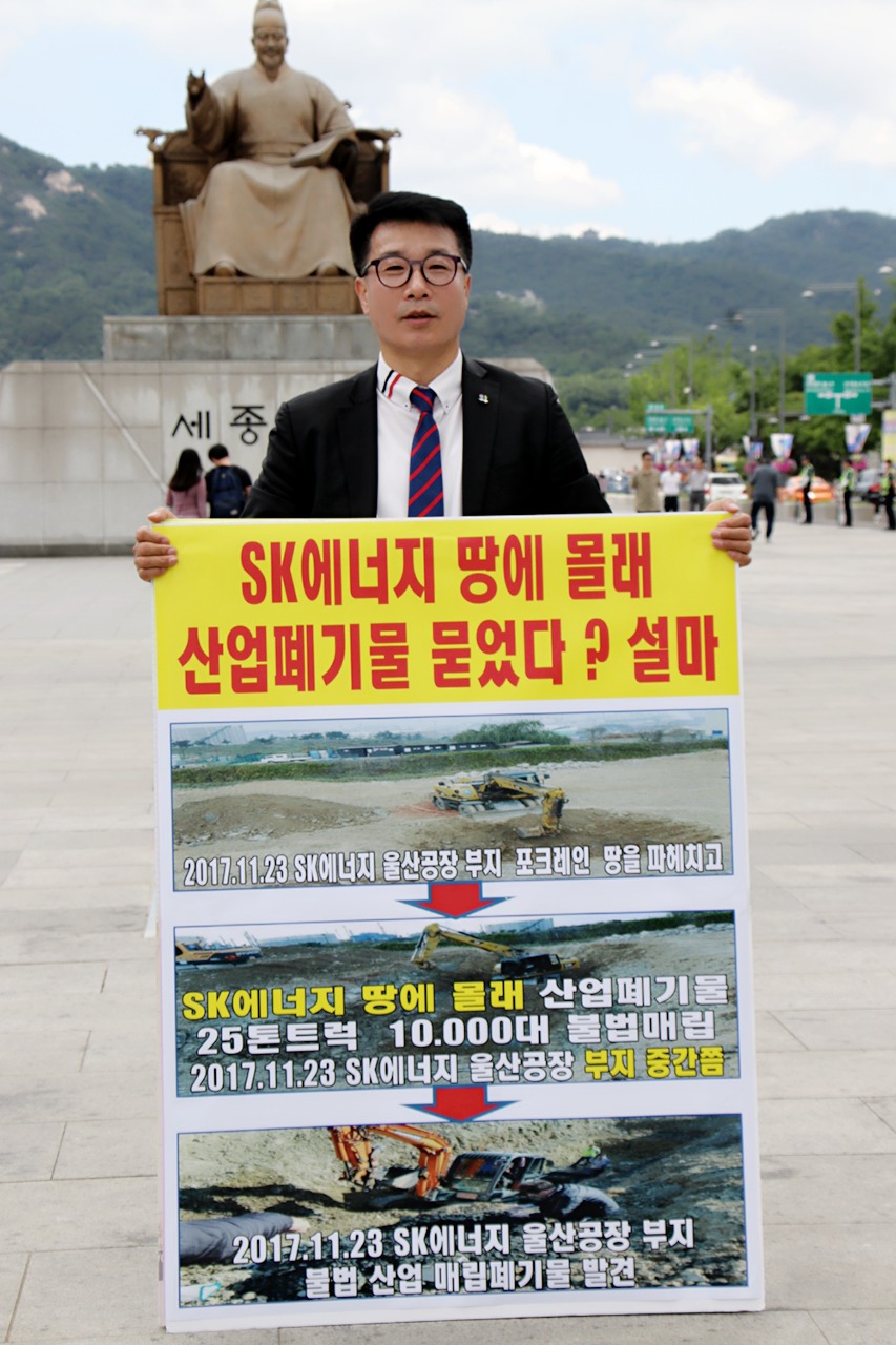 글로벌에코넷 환경적폐 기업 반드시 응징 SK에너지 광화문 1인시위 산업폐기물 불법 매립업체, 고발 및 즉시 원상복구 촉구 공동 기자회견 공익제보자 25톤트럭 10,000여대 엄청난 양, SK에너지 불법매립 침묵은 단순한 묵인인가, 아니면 유니큰과 공범 의혹 |