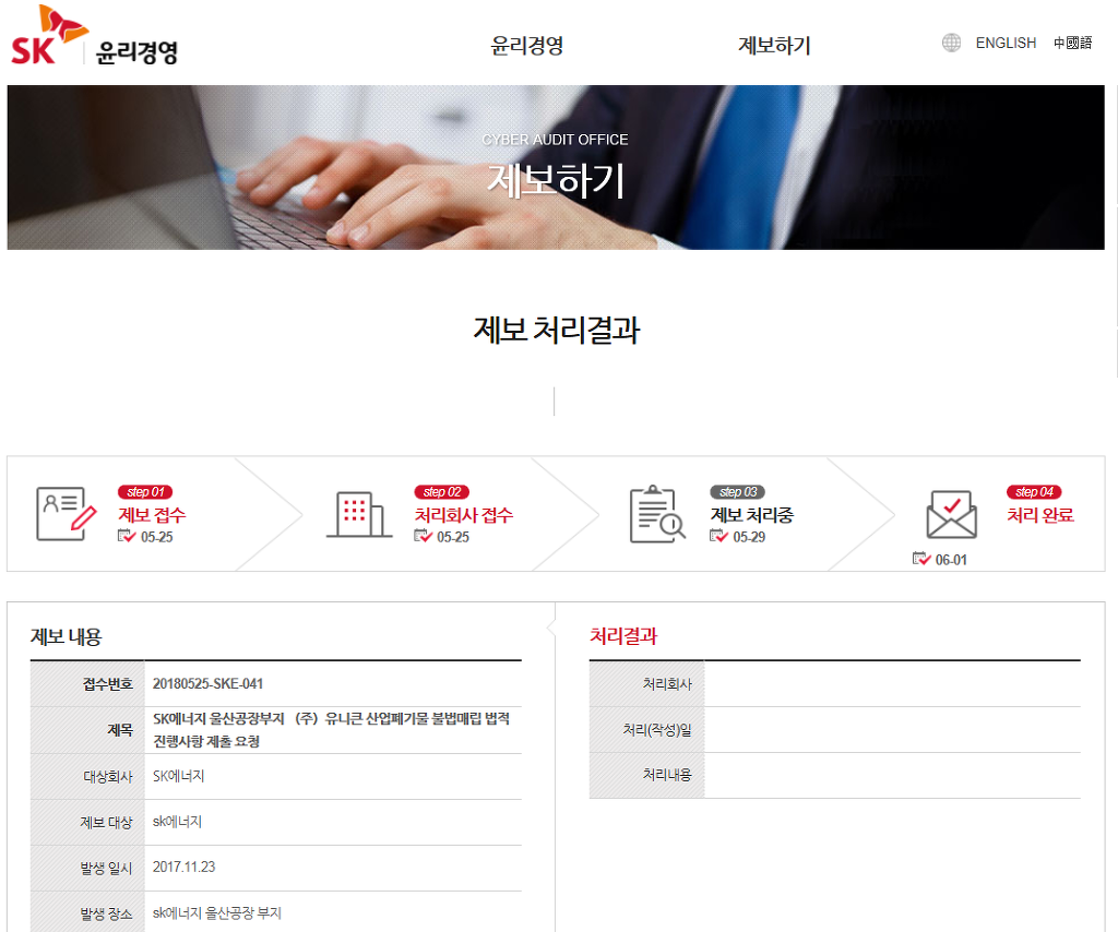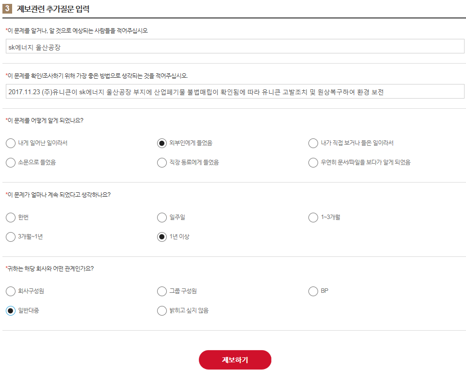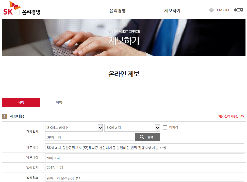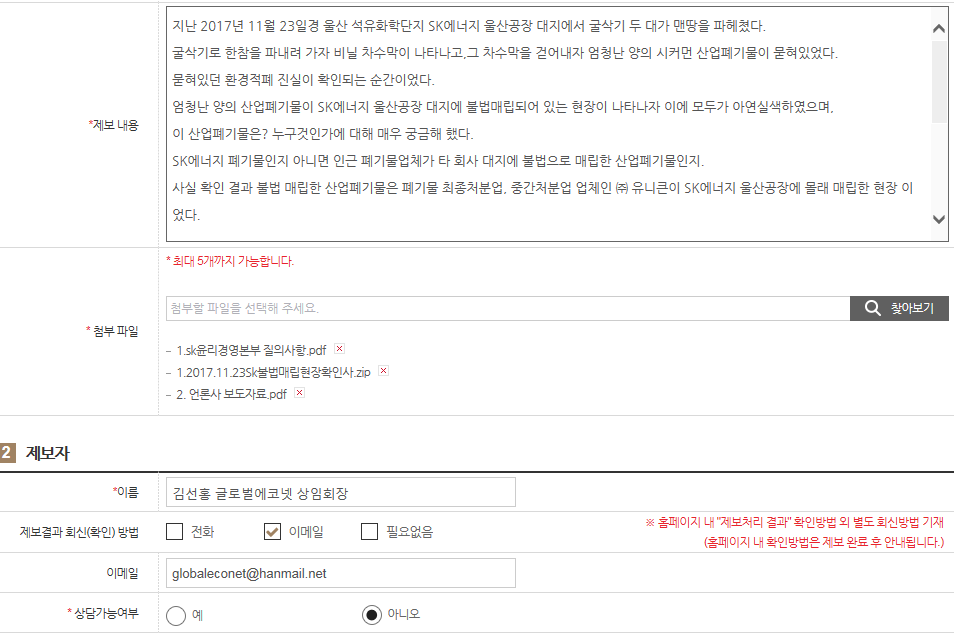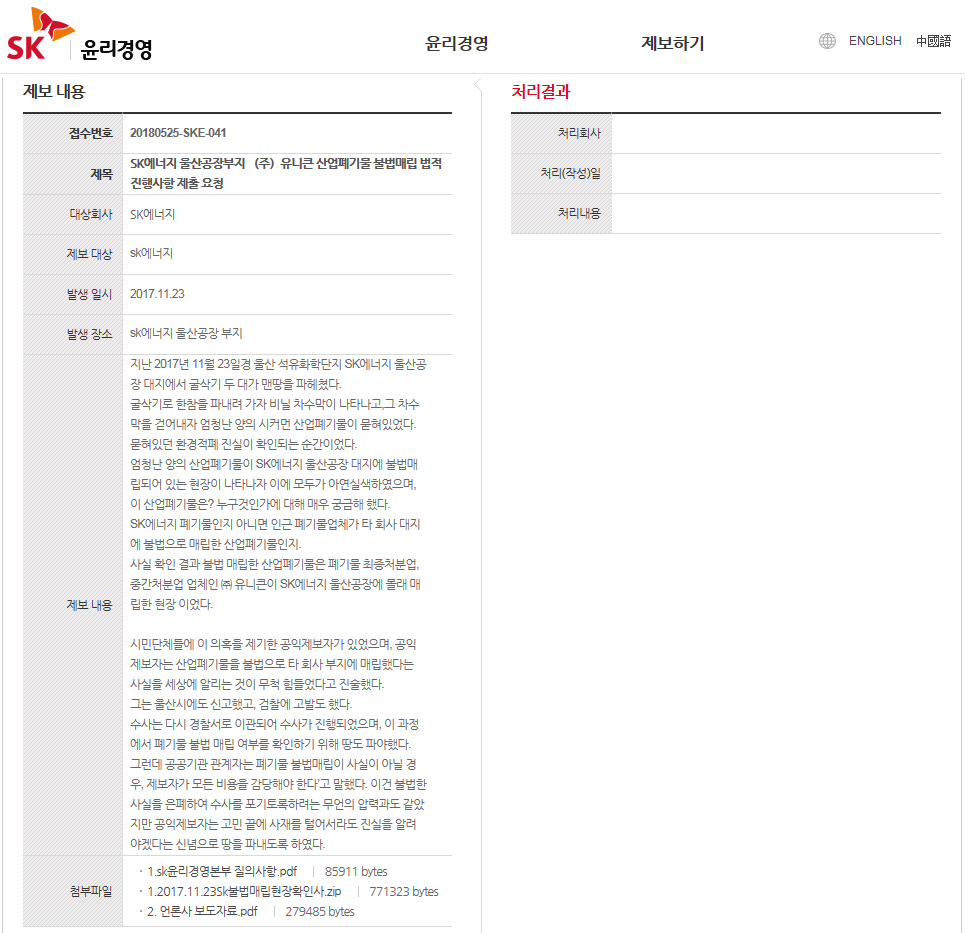 글로벌에코넷 환경적폐 기업 반드시 응징 SK에너지 광화문 1인시위 산업폐기물 불법 매립업체, 고발 및 즉시 원상복구 촉구 공동 기자회견 공익제보자 25톤트럭 10,000여대 엄청난 양, SK에너지 불법매립 침묵은 단순한 묵인인가, 아니면 유니큰과 공범 의혹 |