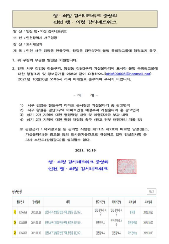 | 인천 서구 한들 지구, 검단3구역 가설울타리 4~5Km 추정 시민단체, “대한민국 최대 불법 옥외광고물” 특혜 의혹 제기 - 불법 옥외광고물 원상복구, 행정 대집행 촉구 - 시민단체들, 아파트 분양광고 삭제 후 공익 목적 광고로 교체 하라! 서구 검암역에서 완정역 방향으로 향하다보면 대규모 고층아파트 건설현장 주변에 1.5Km정도 안전펜스(가설울타리)가 설치되어 있고, 또 왕길역 인근 검단 3구역 주변에도 약3Km정도 사각형을 이루는 가설울타리가 설치되 있다. 지난 2020년부터 한들 지구 1.5Km, 검단 3구역 3Km정도 가설울타리에는 아파트 분양홍보로 도배가 된 채 설치되어 인근 주민들과 통행하는 주민조차 가설울타리 분양홍보가 당연한줄 알고 있다. 21일 오전 인천 시청계단 앞에서 인천 행‧의정 감시네트워크(상임대표 김선홍), 기업윤리경영을 위한 시민단체협의회(이하 “기윤협” 공동대표 이보영)등 시민단체들은 한들 지구, 검단3구역 분양홍보는 대한민국 최대 불법 옥외광고물이라고 주장하고, 약 2년에 조금 못미치지만 대규모 특혜 의혹을 제기하고 기자회견을 개최했다. 시민단체들은 옥외광고물 등 관리법 시행령 제11조 제7호에 따르면 담장(펜스, 가설울타리)은 광고물 등의 표시금지물건으로 규정돼 있으며, 공익목적 및 시공사항만 할 수 있고 상업광고 등 일체를 게시할 수 없도록 제한하고 있다고 강조하면서, 2020년 5월, 11월 등 한들 지구 등 불법 옥외광고물과 서구청 행정조치는 언론기사에도 보도된바 있다고 주장했다. 김선홍 인천 행‧의정 감시네트워크 상임대표는 인천시와 서구청의 한들구역 환경영향평가, 검단3구역 앞 사월마을 인근 완충녹지 지정에서도 특혜의혹을 주장했지만, 이번엔 4~5Km추정 대한민국 최대 불법 옥외광고물까지 보면서 2년에 걸쳐 수십억 이상의 홍보비 특혜의혹을 제기했다. 서구청에 19일자로 정보공개를 요청했고, 서구청 도시재생과와 전화통화로 2020년 500만원, 2021년 500만원 이행 강제금 부과를 확인했다면서, 이번 기자회견을 통해 서구청에 행정 대집행을 요구했다고 강조했다. 김 상임대표는 옥외광고물 등 관리법 시행령에 따라 분양홍보물을 인천시나 서구청의 공익홍보로 교체할 것을 촉구 |