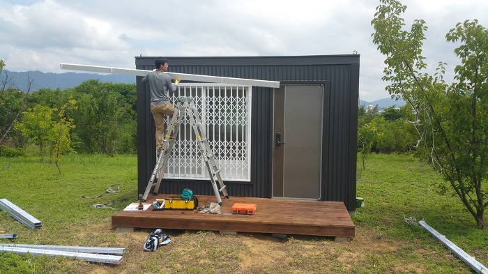 한 달 전부터 가져다 놓는다는 중앙교회 4800평 매실 밭 임시기도실이 들어왔다.