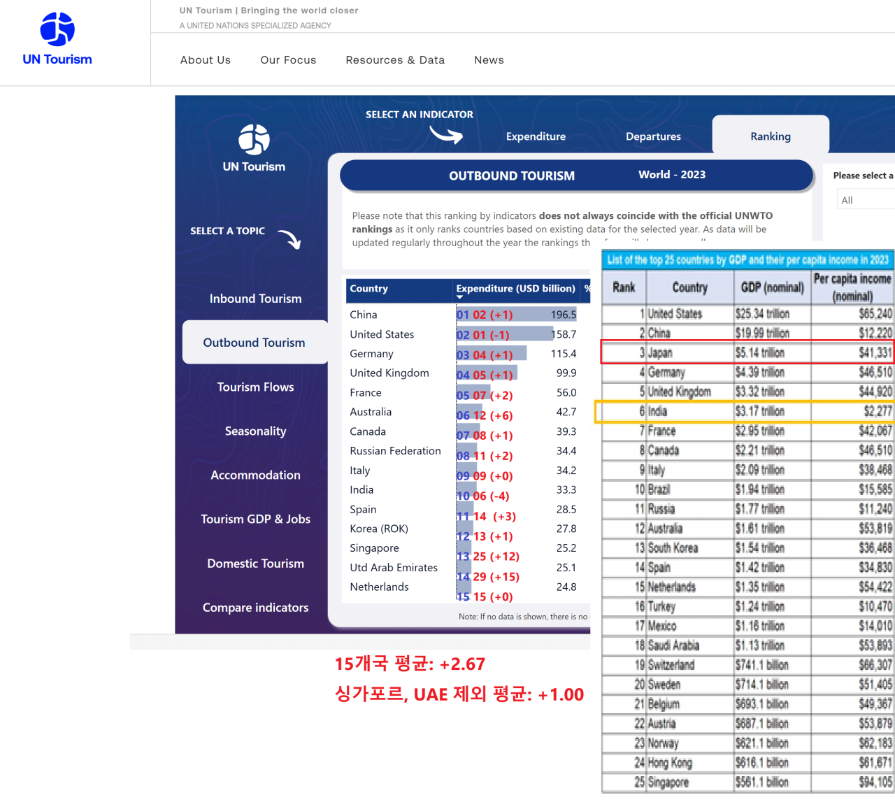 1인당 GDP와 1인당 평균 해외여행 지출액을 비교하든, 전체 GDP와 전체 해외여행 지출액을 비교하든 의미는 동일하지만.