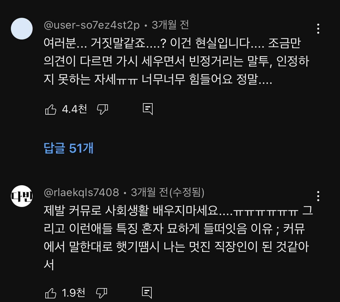 답댓글 작성자라피스라쥴리 작성시간 26.01.05 2222 이런 사람이 하필 제일 고연차여서 생트집 잡으면서 내말맞 꼰대 되면 옆에서 일할 때 피곤
