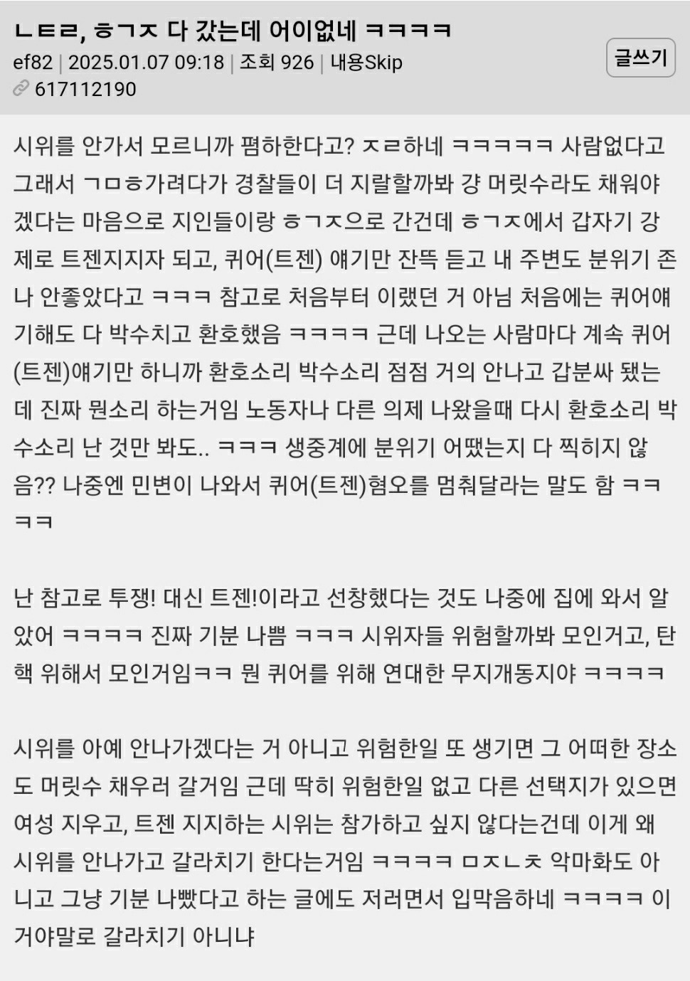 요즘 계속 트젠 때문에 퀴어까지 욕 먹는데 억울한 퀴어들 많을걸