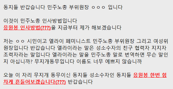 그런 여자들 앉혀놓고 민주노총 부위원장이 무지개 동지라고 발언