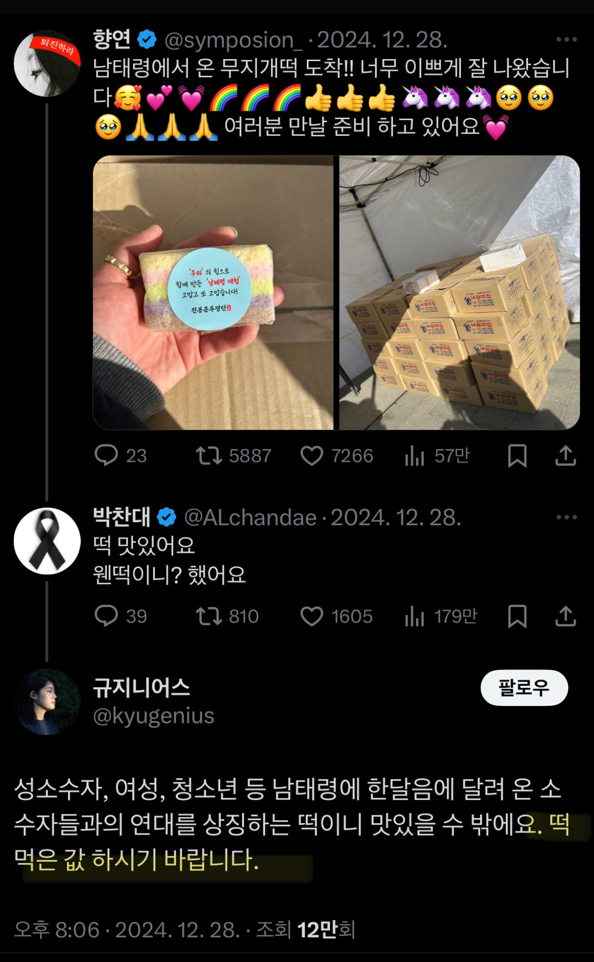전농이 남태령에 달려와 함께해준 사람들 고마워서 무지개떡을 준비함