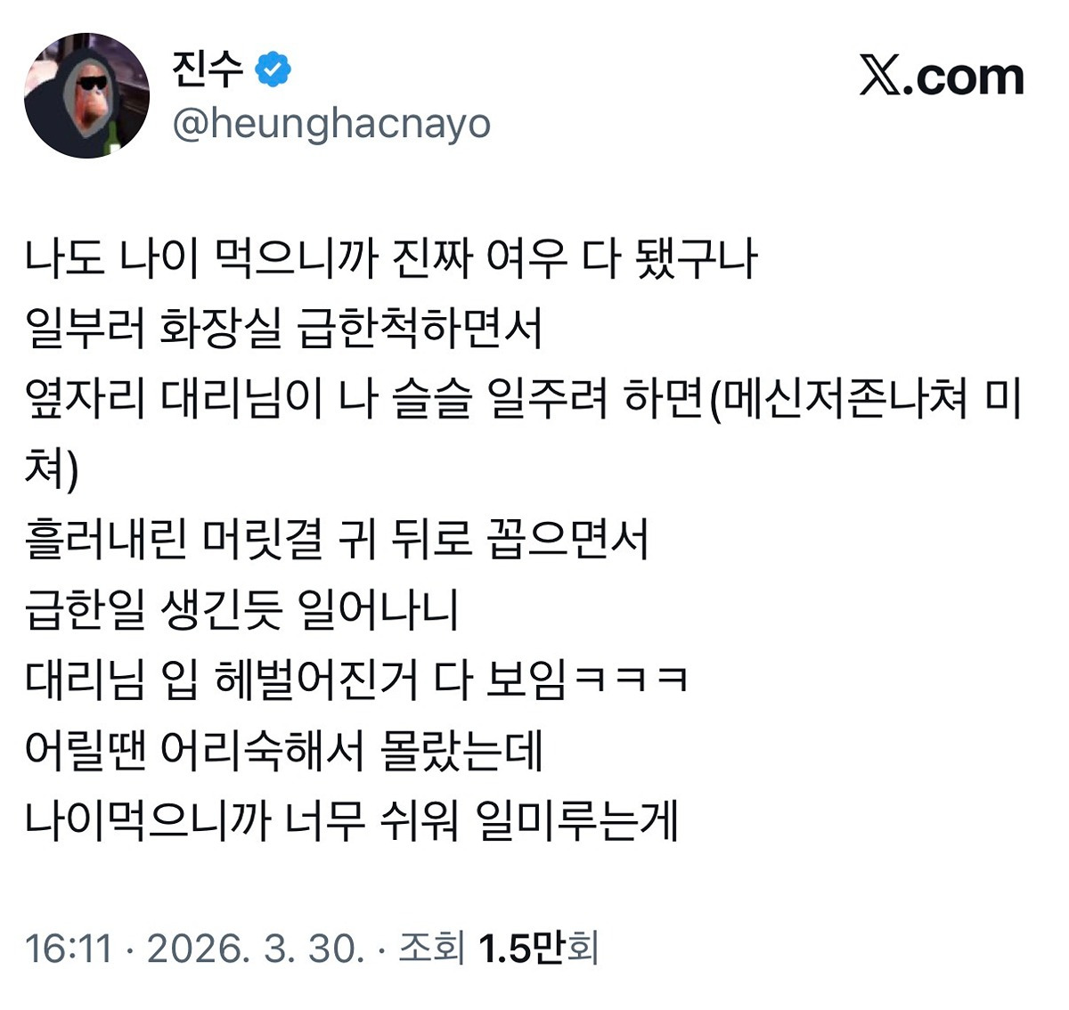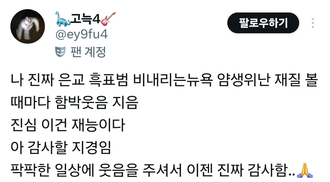 [Out겨]나도 나이먹으니까 진짜 여우 다 됐구나 작성자고요한|작성시간26.03.31|조회수355 목록 댓글 17 글자크기 작게가 글자크기 크게가 내가 아는 카페 ⓒ 고요한원출처 : https://theqoo.net/square/4144523045더쿠 - (길티주의) 나도 나이 먹으니까 진짜 여우 다 됐구나여기를 눌러 링크를 확인하세요theqoo.net 다음검색 현재 게시글 추가 기능 열기 북마크 신고 센터로 신고 댓글 댓글 17 댓글쓰기 답글쓰기 댓글 리스트 작성자행복 | 작성시간 26.04.01 zㅋㅋㅋㅋㅋㅋㅋ아 조롱하는거개웃기네 작성자체리콕 | 작성시간 26.04.01 비내리는 뉴욕을 모르는게 분하다짤 개웃겨 ㅅㅂㅋㅋㅋㅋㅋ 작성자베베토 | 작성시간 26.04.01 하쉬 비내리는뉴욕 뭐지 답댓글 작성자1-4-3 | 작성시간 26.04.01 ㅈㄴㄱㄷ 비오는날 길가다가 비오던 뉴욕 생각나서 길바닥에서 쳐울었대 작성자크루엘라 드빌 | 작성시간 26.04.01 ㅋㅋㅋㅋㅋㅋㅋㅋㅋㅋㅋㅋㅋㅋ미친ㅋㅋㅋ 댓글 전체보기