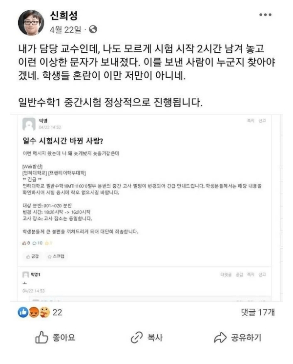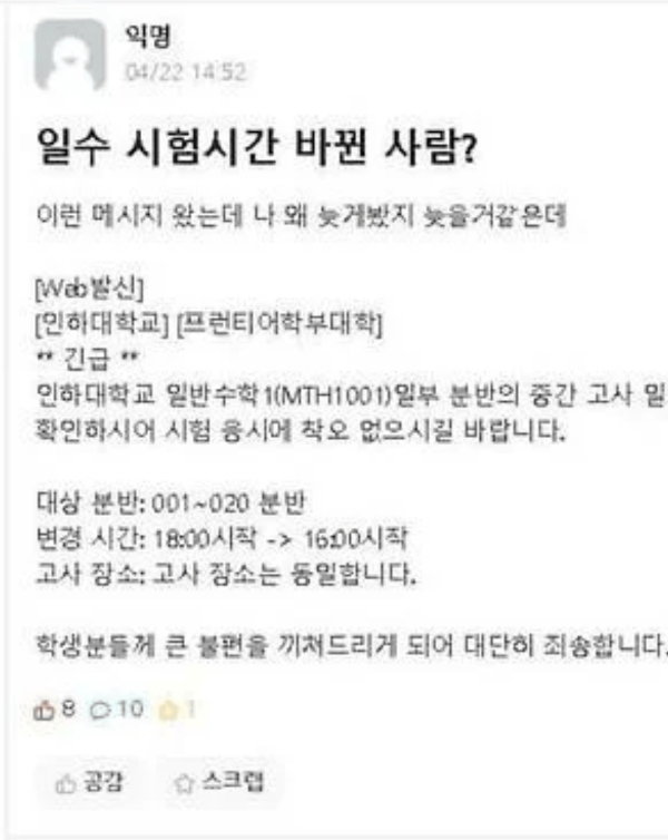 [스크랩] [궁금하면오백원]장난쳤다가 나락간 대학생 작성자문재인|작성시간26.04.10|조회수416 목록 댓글 15 글자크기 작게가 글자크기 크게가 출처: 여성시대 (마구마구)시험시간 2시간 땡겨졌다고 사칭문자 뿌림 다음검색 스크랩 원문 : *여성시대* 차분한 20대들의 알흠다운 공간 현재 게시글 추가 기능 열기 북마크 신고 센터로 신고 댓글 댓글 15 댓글쓰기 답글쓰기 댓글 리스트 작성자Defying Gravity | 작성시간 26.04.10 왜저러냐 작성자건들이다x건드리다o | 작성시간 26.04.10 전과목f로 학생들 화가 풀리겠어? 작성자wave to earth | 작성시간 26.04.10 저런 장난 왜 해 진심...? 그냥 이해 자체가 안 감 저 발상이 작성자썬칩최고 | 작성시간 26.04.10 처벌이 좀 약하지 않나 작성자승희 | 작성시간 26.04.13 왜저러는거야? 댓글 전체보기