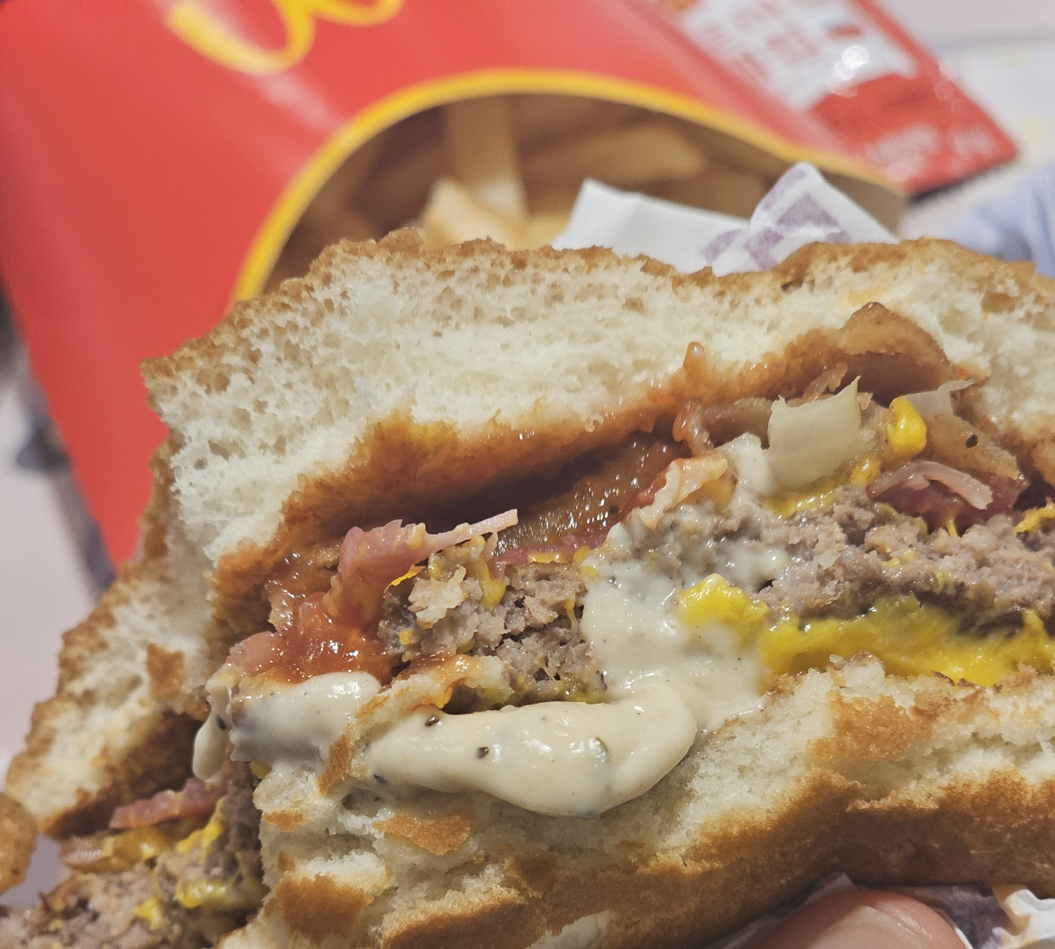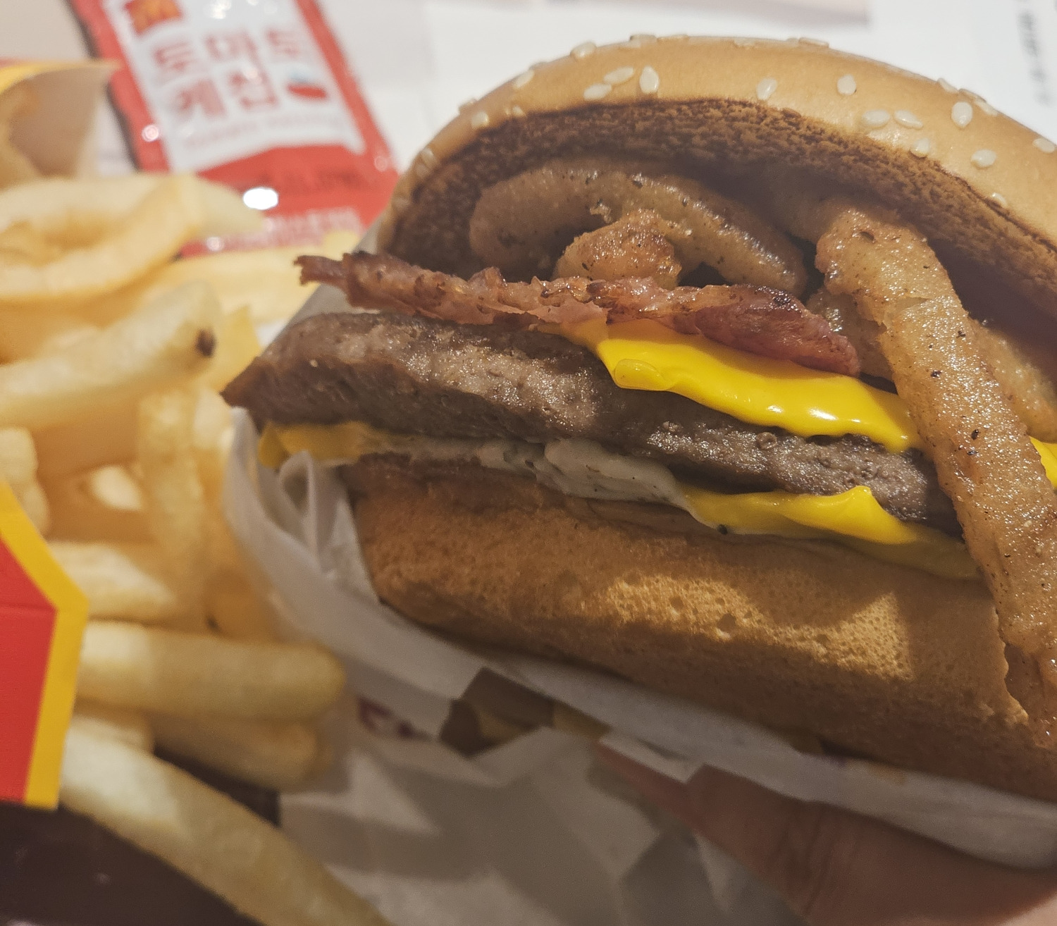 케찹&머스타드? - 피클 - 어니언후라이 - 베이컨 - 치즈 - 패티 - 치즈 - 크리미파마산소스