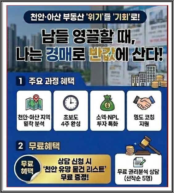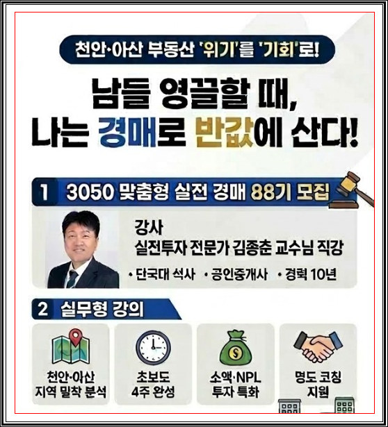 작성자박병섭작성시간26.03.12조회수16 목록 댓글 0| (천안경매학원) 김종춘 교수님이 진행하는 04월 (한달 과정) 실전으로 출발하는 경매 초/중급자-1과정 88기 개강안내 개강일 : 04월 06일 월요일 오전 10시 ~ 12시 1.경매초 중급자가 혼자 할 수 있는 실수 없는 입찰물건조사 방법 2.경매초 중급자도 특수물건 투자를 이해해야 수익으로 연결된다. 3.경매투자의 마무리는 서로 웃는 명도하기 (서로 이익이 되는 명도방법) 4.가자 실전투자로 안전한 입찰 방법 분석 교 수 : 김 종 춘 교수님 (서울남자) # 실전투자 전문가 # 공인중개사자격보유 # 천안경매학원 교수 # 단국대학교 정책경영대학원 자산관리학 석사 ■ 교육시간 : 2026년 04월 06일 ~ 04월 27일 (1회/주, 총 4회) ■ 강의시간 : 매주 월요일 오전 10시 ~ 12시(2시간) ■ 수강료 : 15만원 (선불 입금 후 댓글로 접수) ■ (학원계좌번호 농협 302-5451-2920-11 예금주 : 전선경) ■ 강의장소 : 천안 부동산 경매 학원 (천안시 동남구 신부동 82-11번지 호암빌딩 4층) ■전화접수문의 : 041-900-1300 ■ 강의교재 : (천안 아산 부동산 실전 경매물건 분석 및 유인물) ■ 본 과정은 경매강의가 처음인경우 및 경매유튜브를 보신경험이 있으신 분들이라면 실전투자에 앞서 이론과 실전투자의 차이점을 이해하고 안전하게 실전투자를 하기위한 가이드 역할하는 실전사례 강의 입니다. ■ 천안경매학원은 이론강의가 중심이 아닌 천안 아산시에서 진행되고 있는 실전경매사례 강의가 중심으로 진행하여 경매초급자 및 연세가 있으신 분들도 충분히 수강할 수 있는 강의로 진행됩니다. 안전하고 수익이 나는 건전한 경매공부를 위하여 노력하는 천안경매학원이 되겠습니다. ◆강의 계획◆ |