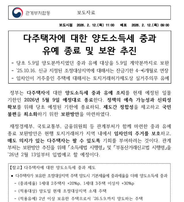 다주택자에 대한 양도소득세 중과 유예 종료 및 보완 추진 작성자박병섭|작성시간26.02.19|조회수55 목록 댓글 0 글자크기 작게가 글자크기 크게가 다주택자에 대한 양도소득세 중과 유예 종료 및 보완 추진 다음검색 현재 게시글 추가 기능 열기 북마크 공유하기 신고 센터로 신고 댓글 댓글 0 댓글쓰기 답글쓰기 댓글 리스트