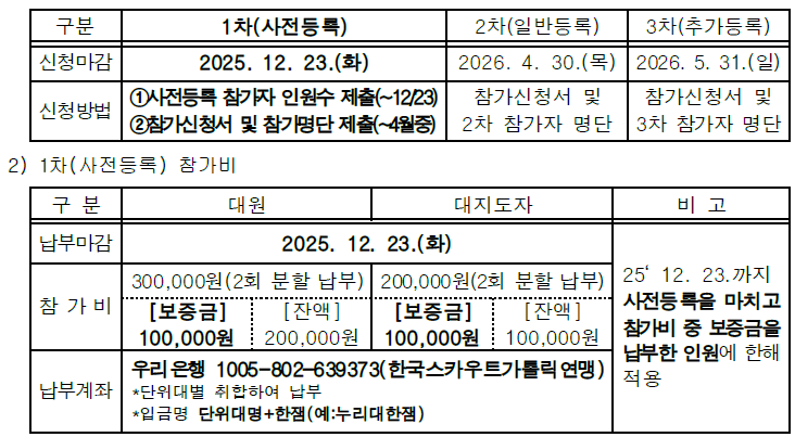 2. 한국스카우트연맹에서는 2026년 강원특별자치도 세계잼버리수련장에서 개최되는 제16회 한국잼버리 1차(사전등록) 참가자를 아래와 같이 모집하오니 관심 있는 대원 및 지도자로 하여금 참가 신청할 수 있도록 안내하여 주시기 바랍니다.
