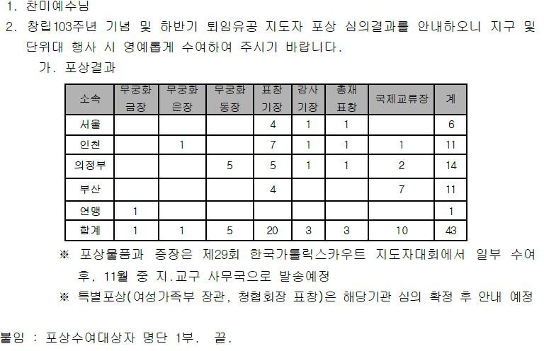 [[스카우트연맹]]창립103주년 기념포상 외 심의결과 안내 작성자박소현 마틸다|작성시간25.11.05|조회수59 목록 댓글 0 글자크기 작게가 글자크기 크게가 (S공문)창립103주년 기념포상 외 심의결과 안내.pdf152.16KB붙임1. 창립 103주년 기념 포상 수여대상자 명단.xlsx16.42KB 첨부파일첨부된 파일이 3개 있습니다. png 파일 image.png 다운로드 xlsx 파일 붙임1. 창립 103주년 기념 포상 수여대상자 명단.xlsx 다운로드 pdf 파일 (S공문)창립103주년 기념포상 외 심의결과 안내.pdf 다운로드 다음검색 현재 게시글 추가 기능 열기 북마크 공유하기 신고 센터로 신고 댓글 댓글 0 댓글쓰기 답글쓰기 댓글 리스트
