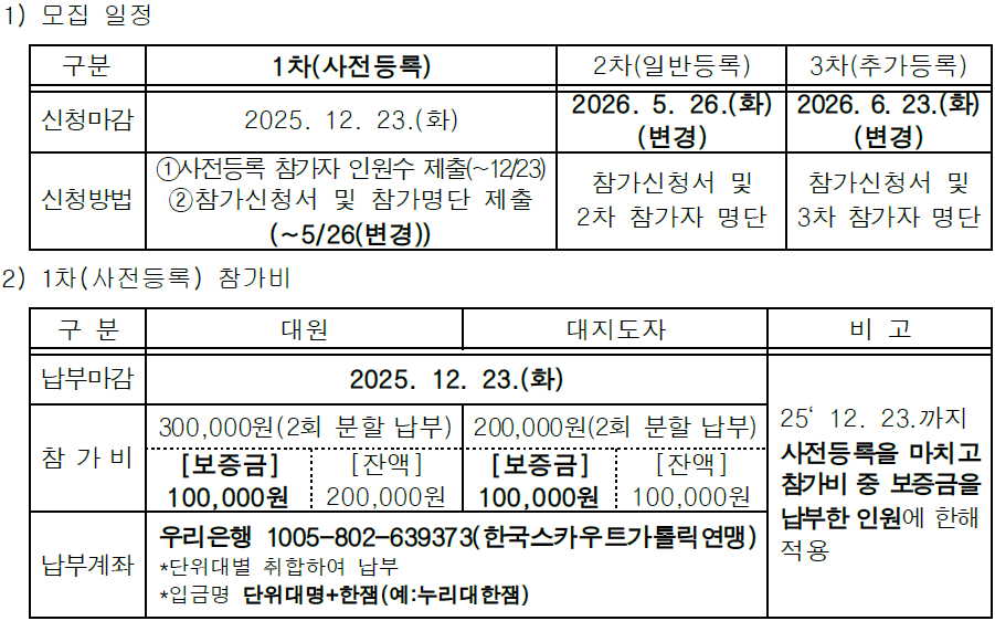 2. 한국스카우트연맹에서는 2026년 강원특별자치도 세계잼버리수련장에서 개최되는 제16회 한국잼버리의 참가 등록 일정이 변경됨에 따라 아래와 같이 재안내 하오니 관심있는 대원 및 지도자로 하여금 참가 신청할 수 있도록 안내하여 주시기 바랍니다.