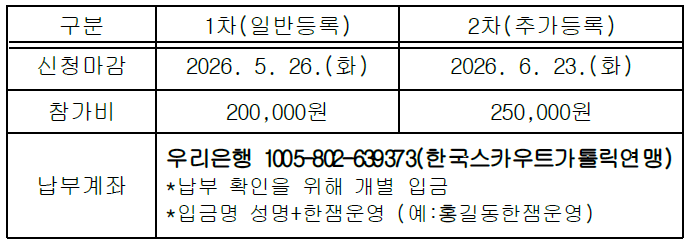 2. 한국스카우트연맹에서는 2026년 강원특별자치도 세계잼버리수련장에서 개최되는 제16회 한국잼버리 운영지도자(운영요원) 참가자를 아래와 같이 모집하오니 관심있는 지도자로 하여금 참가 신청할 수 있도록 안내하여 주시기 바랍니다.